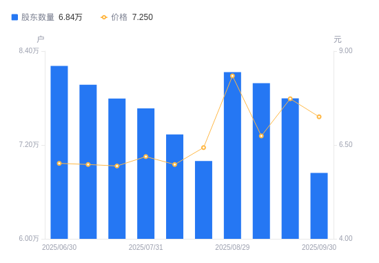 日期A股户数(户)流通A股户均持股数(股)户均持股市值(万元)2025-10-106847820359.4313.622025-09-306842220376.0914.772025-09-197796117882.9513.822025-09-107989917449.1911.762025-08-298131817144.7014.302025-08-206995719929.0012.812025-08-087334419008.6811.372025-07-317667018184.0711.262025-07-187794117887.5410.632025-07-107969517493.8610.46