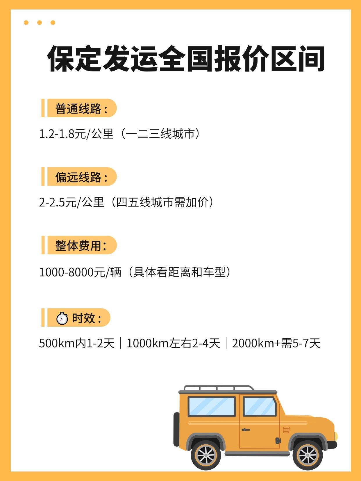 ✨ 保定发全国报价区间 💰 小板车(专线): 1.5-2.5元/公里(短途优选) 💰 大板车(拼车): 0.8-1.8元/公里(长途划算) ⏱ 时效: 500km内1-2天|1000km左右2-4天|2000km+需5-7天 🔍 托运前必做检查!划重点! ✅ 车身360°拍照: 尤其是现有刮痕、凹陷(高清图留证!) ✅ 油量控制: 保留1/4箱油,减重+保安全 ✅ 拆掉私人物品: 贵重物、易燃品别留车内! ✅ 关闭防盗器: 避免运输途中耗电亏电 ✅ 核对证件: 行驶证复印件随车,原件自己带 ⚠️ 提车发现刮痕怎么办? ❗️立刻操作: 1️⃣ 拒绝签收: 当场和司机共同验车,发现问题标注在合同! 2️⃣ 疯狂拍照+视频: 刮痕细节+全景车辆,带时间水印! 3️⃣ 联系客服索赔: 出示合同标注+照片,正规公司会走保险理赔! 👉 切记: 没验车就签字=放弃索赔!别心软!