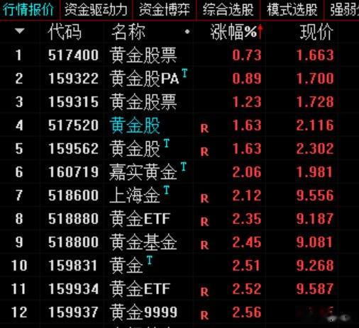 稳健派:选黄金ETF,是黄金现货类ETF,直接挂钩金价,波动小,走势稳,基本属于“小慢牛型选手”,这类的黄金ETF现基本都涨出了历史新高。