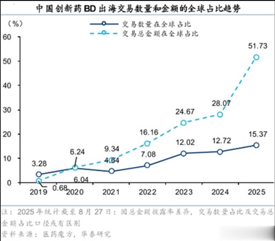 先看组硬核数据:华泰研报显示,今年截至8月17日,中国创新药BD出海交易数量在全球占了15.37%,交易金额更猛,直接占了51.73%!这意味着咱们创新药在全球市场,已经从“小透明”变成“重量级选手”了。