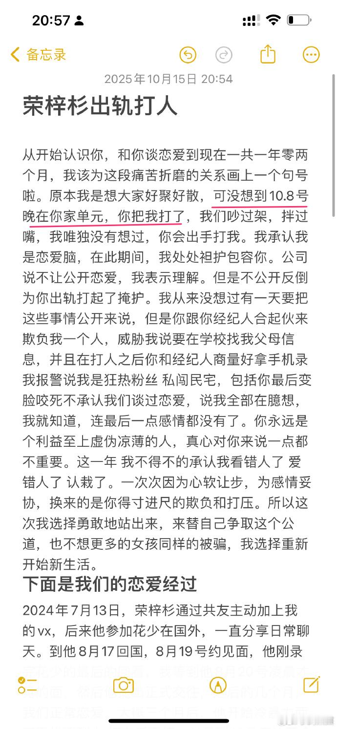 李禹熹毕业于中央戏剧学院2021级表演本科班,是荣梓杉的学姐。她称荣梓杉是通过共同朋友主动添加自己微信,确认恋爱关系。但恋爱几个月后荣梓杉就冷暴力不联系,李禹熹称他至少同时暧昧了三个女生。李禹熹因为荣梓杉而焦虑抑郁,两人多次吵架沟通及复合,10月8日李禹熹想跟荣梓杉说清楚,因为她觉得双方是有感情的,没想到荣梓杉见到她就直接动手打人,殴打过程发生在荣梓杉家楼道,李禹熹选择报警,荣梓杉经纪人拿着手机录影质问李禹熹,试图制造女方是狂热粉丝的虚假证据,并报警说女方是粉丝私闯民宅。