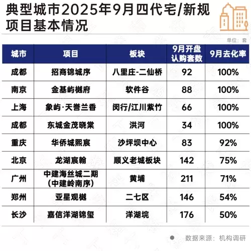 从典型城市2025年9月四代宅/新规项目基本情况来看,成都、重庆、南京等城市均有四代宅/新规项目热销。