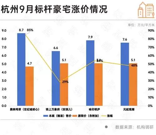 杭州大家咏印明庐和华润元起观潮两个标杆豪宅均在9月相继入市,继锦上万象府后再涨1-1.3万元/平方米,较限价涨幅约五成。