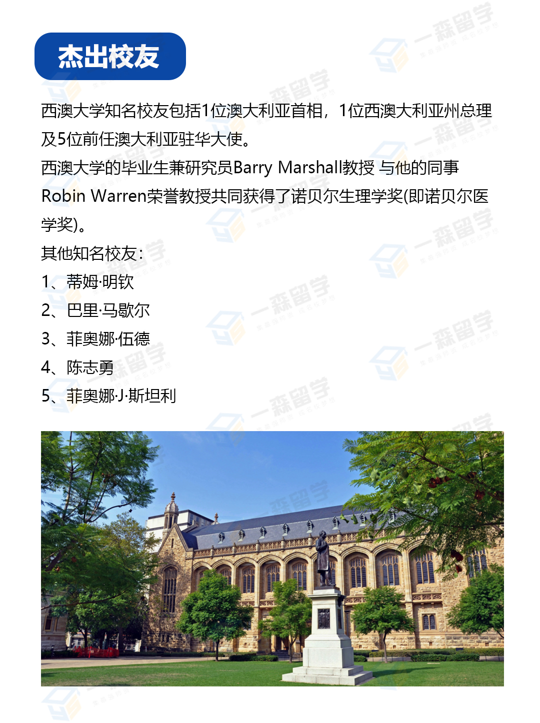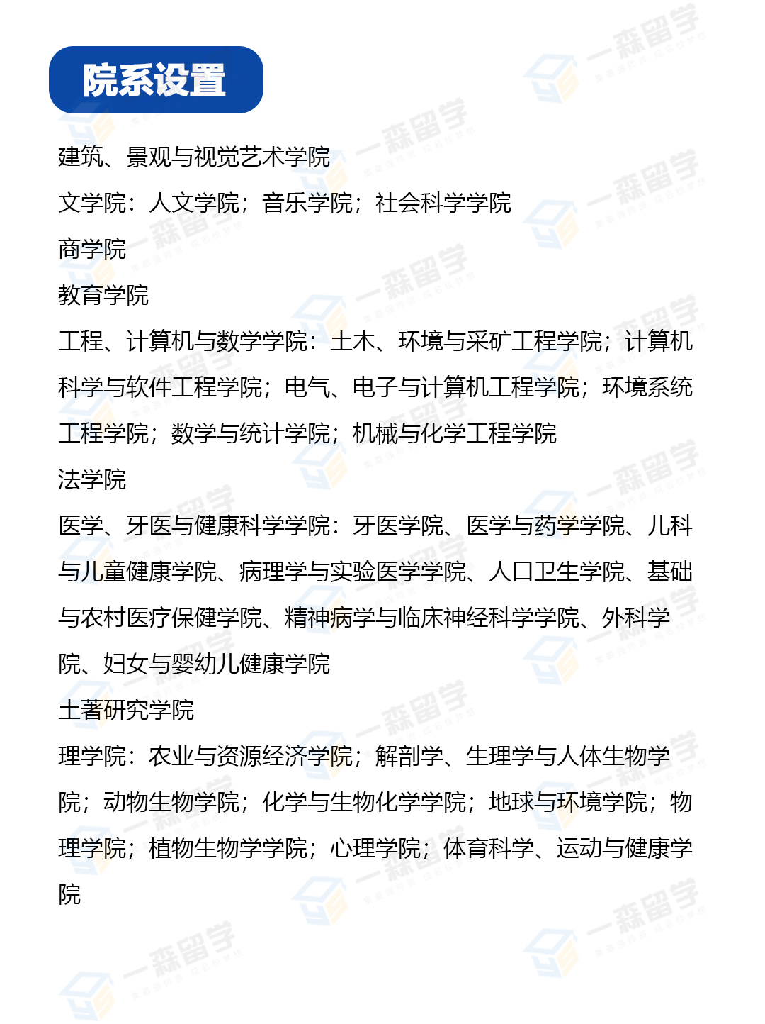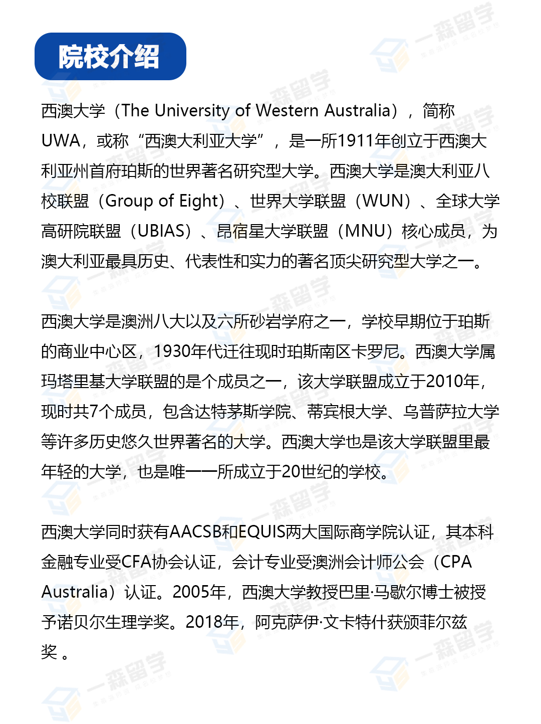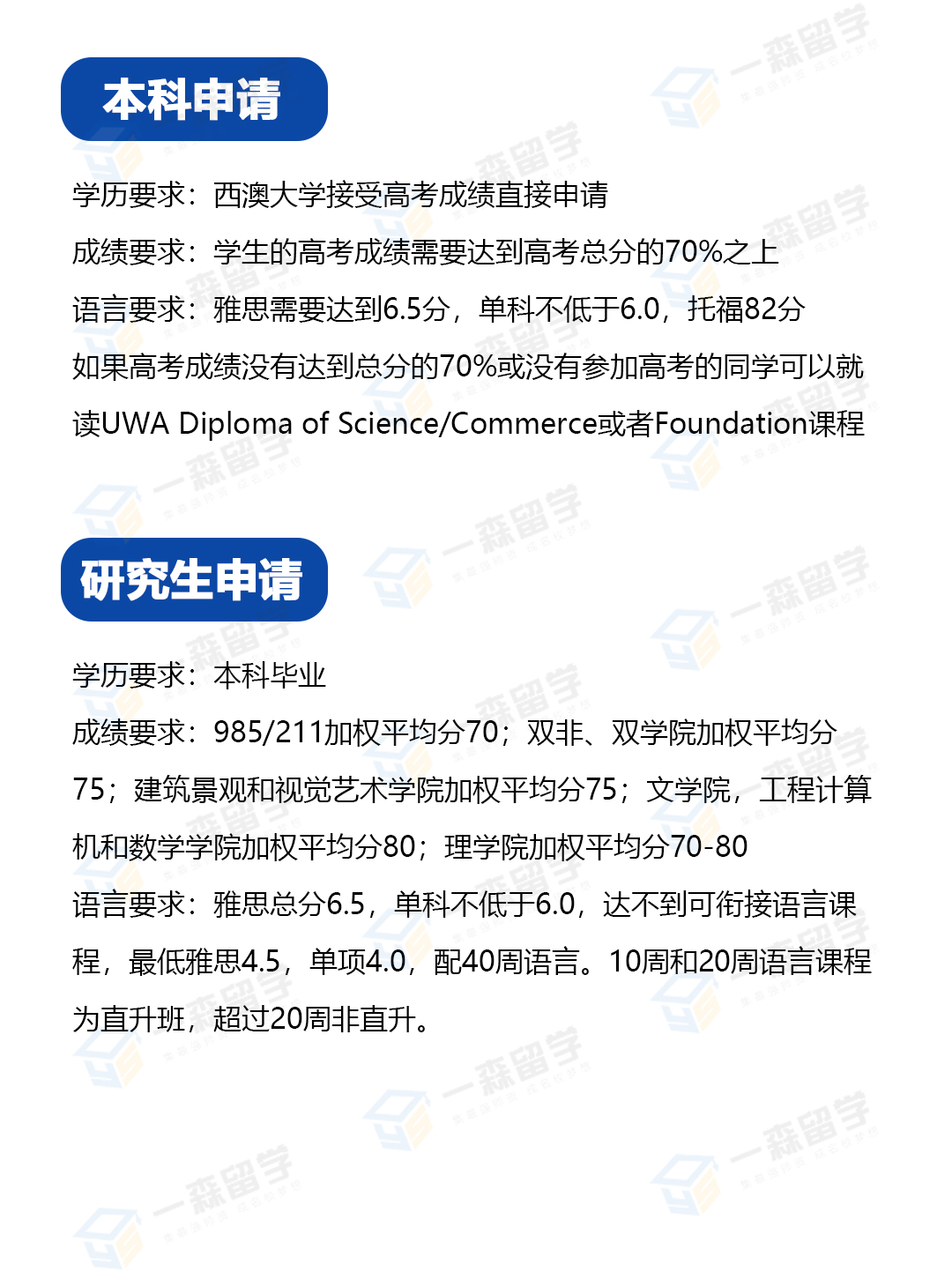 本科申请 学历要求:西澳大学接受高考成绩直接申请 成绩要求:学生的高考成绩需要达到高考总分的70%之上 语言要求:雅思需要达到6.5分,单科不低于6.0,托福82分 如果高考成绩没有达到总分的70%或没有参加高考的同学可以就读UWA Diploma of Science/Commerce或者Foundation课程 研究生申请 学历要求:本科毕业 成绩要求: 985/211加权平均分70;双非、双学院加权平均分75 建筑景观和视觉艺术学院加权平均分75 文学院,工程计算机和数学学院加权平均分80 理学院加权平均分70-80 语言要求: 雅思总分6.5,单科不低于6.0,达不到可衔接语言课程,最低雅思4.5,单项4.0,配40周语言 10周和20周语言课程为直升班,超过20周非直升