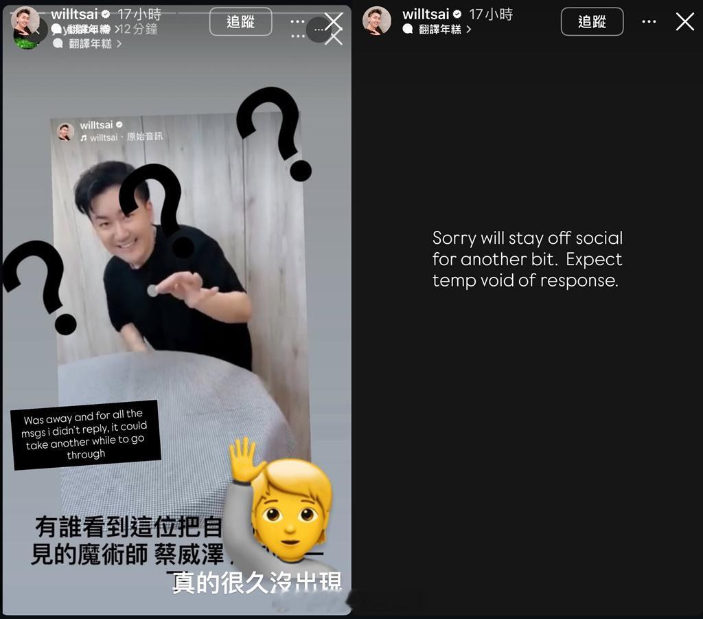 对此蔡威泽回应 “真的很久没露面了”,并发布黑底文字解释:“Sorry will stay off social for another bit. Expect temp void of response.(抱歉会暂时离开社交网站一段时间,预计期间也不会回复消息)”,没有特别多说明原因。