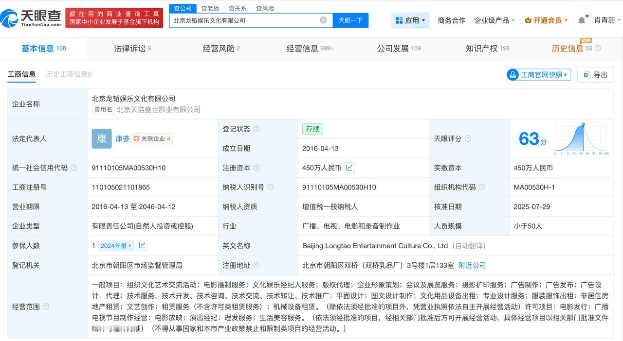 黄子韬公司被冻结50万股权 龙韬娱乐被冻结50万股权 天眼查App显示,近日,北京龙韬娱乐文化有限公司新增一则股权冻结信息,股权所在企业为北京龙韬影业有限公司,冻结股权数额50万人民币,冻结期限自2025年10月13日至2028年10月12日,执行法院为广东省深圳市龙岗区人民法院。 工商信息显示,北京龙韬娱乐文化有限公司成立于2016年4月,法定代表人为康荟,注册资本450万人民币,经营范围包括组织文化艺术交流活动、电影摄制服务、文化娱乐经纪人服务等,由海南永恒星龙文化发展集团有限公司、张建华共同持股。最终受益人信息显示,黄子韬为该公司实际控制人。 天眼查信息:
