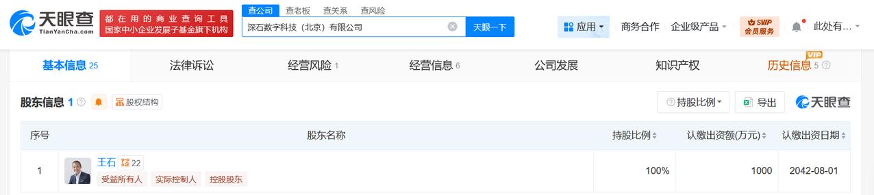王石名下深石数字科技公司经营异常 王石名下一公司经营异常 天眼查App显示,近日,深石数字科技(北京)有限公司因未依照规定的期限公示年度报告,被北京市通州区市场监督管理局列入经营异常名录。 该公司成立于2022年9月,法定代表人为张天,注册资本1000万人民币,经营范围含企业管理、企业管理咨询、社会经济咨询服务、软件开发、规划设计管理、咨询策划服务、会议及展览服务等。股东信息显示,该公司由王石全资持股。 天眼查信息: