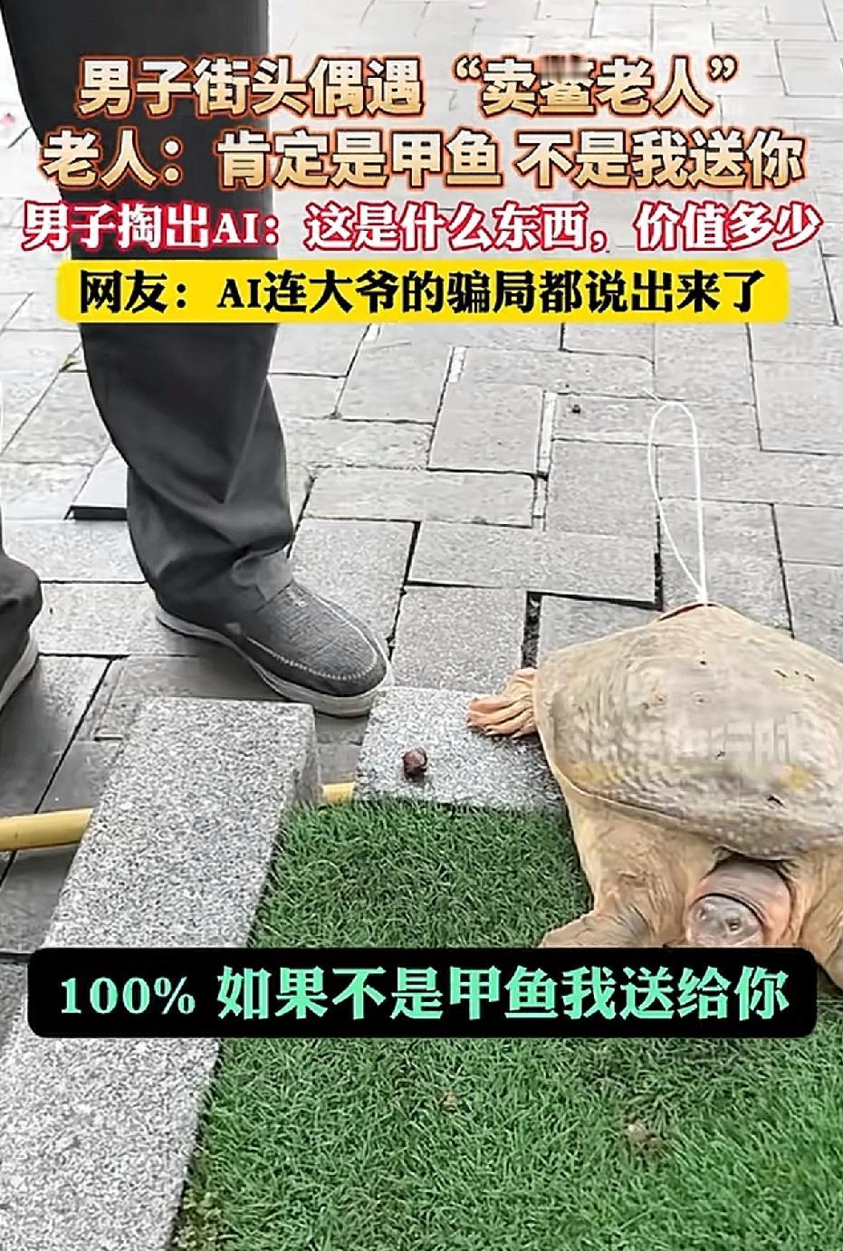 “豆包立功了”。男子在街上碰到一位穿着朴素的大爷,正用扁担挑着一只龟叫卖。男子好奇发问:“这是什么?” 大爷回应道:“这是甲鱼啊。”男子接着问:“从哪儿来的?多少钱?” 大爷说:“干活挖出来的,1300元。” 男子面露疑惑,大爷信誓旦旦的说:“这百分百是甲鱼,要是假的我白送你。” 男子觉得是龟,大爷坚称是甲鱼,他便拿出手机拍照上传到豆包。豆包告知男子:“这是美国珍珠鳖,属于外来入侵品种,生长速度快。” 豆包还进一步说明:“正常价格在20到30元之间,不过在街头售卖时,很多骗子会把它当甲鱼卖,售价高出数倍。” 大爷站在一旁,脸色瞬间变得苍白。 男子对大爷说:“我建议你别在杭州有这种行为。” 大爷默默扛起“甲鱼”离开了。 其实男子早就看出大爷是卖“甲鱼”的骗子,全程都录了像,还借助豆包揭穿了大爷的骗局。 有网友评论:“我爸爸就被这种街头骗局骗了500元。” 如今,手机已成为生活中不可或缺之物,豆包这几年也融入大众生活。因其使用便捷,已取代百度识万物的功能,成为大众新宠。 在人工智能时代,无论年纪大小,当你无法分辨事物好坏对错时,不妨用豆包搜一搜,以免犯错或上当。 每个人在使用的过程中,也是帮着豆包完善功能,毕竟这是我们的豆包。 来源:法治进行时