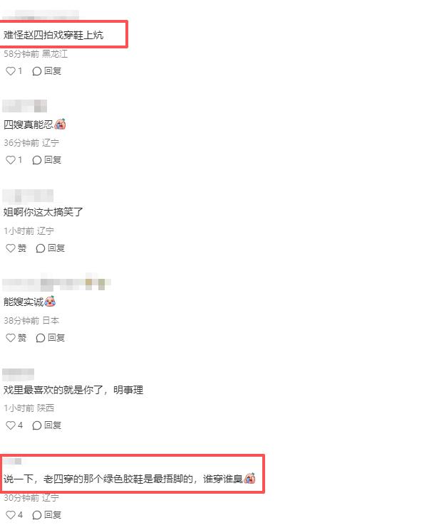 孙立荣直播爆料“赵四”的丑事,尴尬到脚趾抠地,完全不顾忌对方的脸面。 直播的时候,她突然心血来潮,说要给观众们讲个事。 紧接着,她就开始爆料,在拍摄《乡村爱情故事》的时候,大家都在现场拍戏。 恰好当时她和赵四一场戏,两人都在等着开机,孙立荣说她躺在道具的大床上都等累了,就想着眯一会儿。 结果,睡一半她就醒了,心想着怎么这么臭呢,老臭了,还是腥臭腥臭的那种,直接把她给熏醒了。 醒了之后她就在找,是什么玩意儿会这么臭,扭头一歪脖发现老四在她旁边躺着呢。 最让人震惊的是,赵四里面穿着一双红袜子,外面还穿着鞋,哪怕裹的这么严实,他的脚都把孙立荣给熏醒了。 直到现在,孙立荣在直播间爆料的时候,光是想想都忍不住皱起了眉头,捏住了鼻子,说当时脚丫子臭到把她鼻子都堵住了。 评论区的人说,难怪赵四拍戏都是穿鞋上炕。 就是不知道,赵四的扮演者刘小光看见孙立荣的爆料会不会尴尬到脚趾抠地。