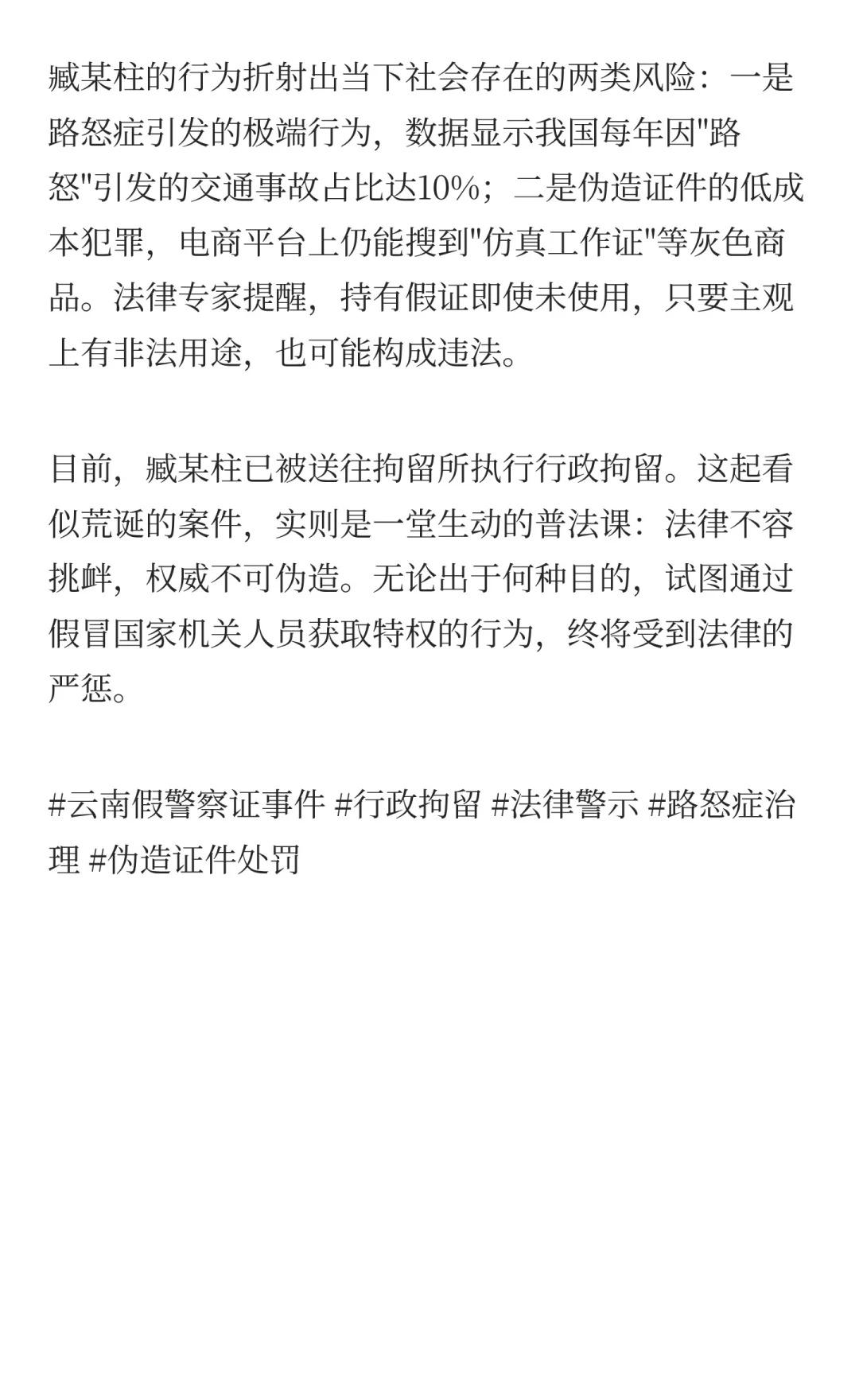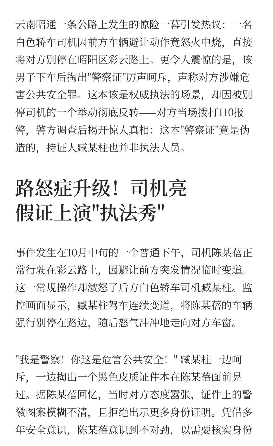 云南司机别车亮假警察证唬人被行拘 假证背 云南假警察证事件 行政拘留 法律警示 路怒症治理