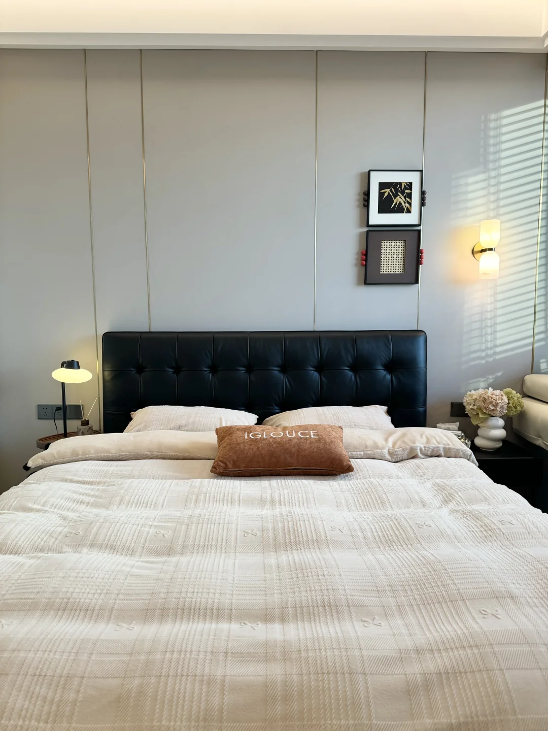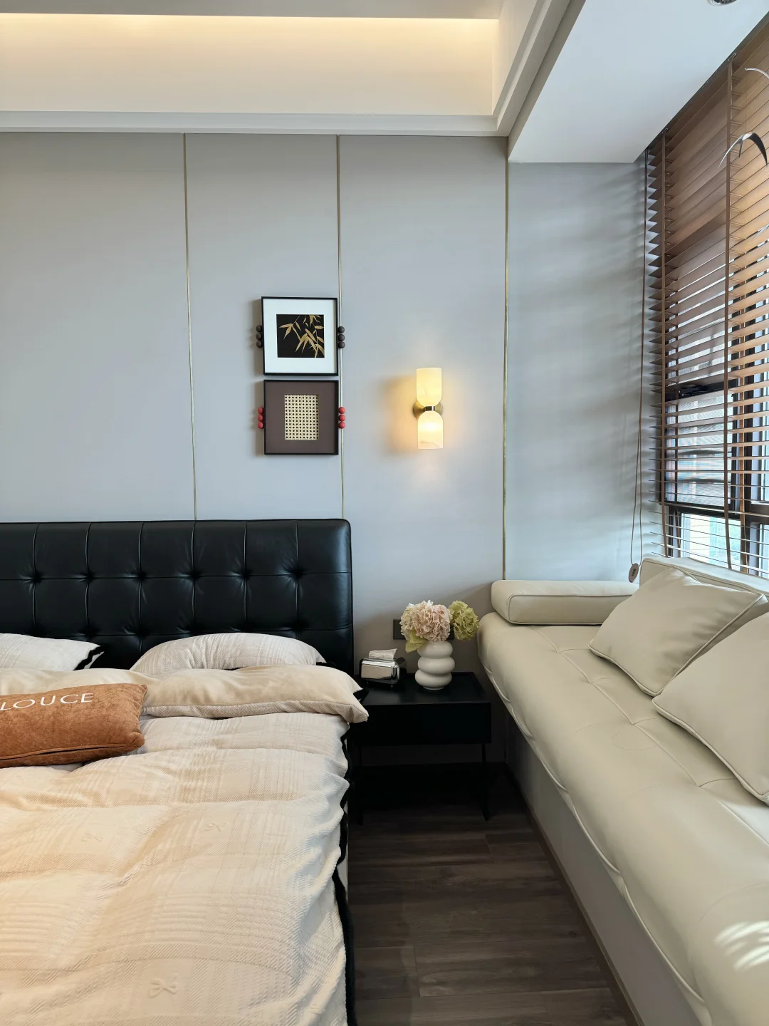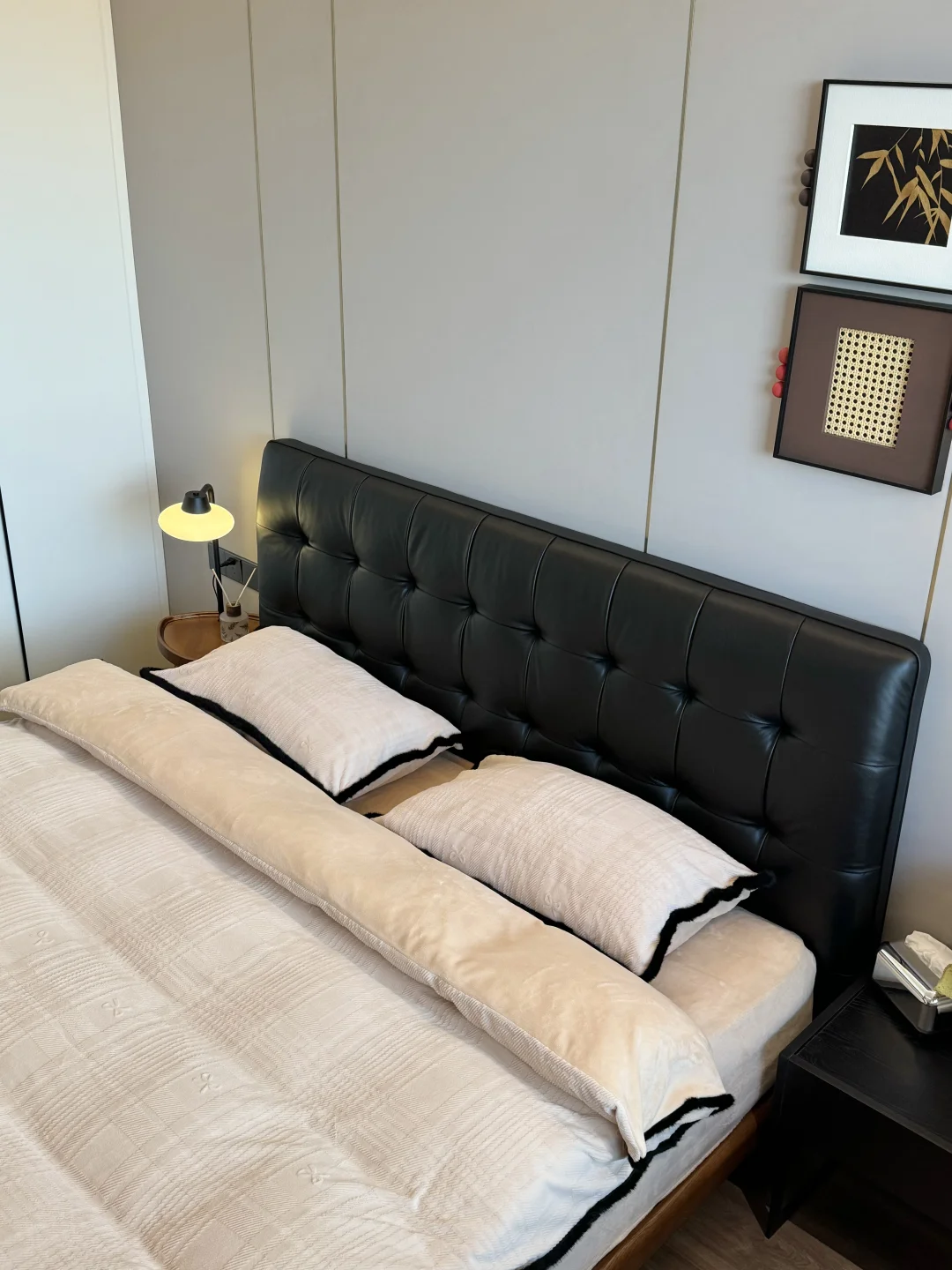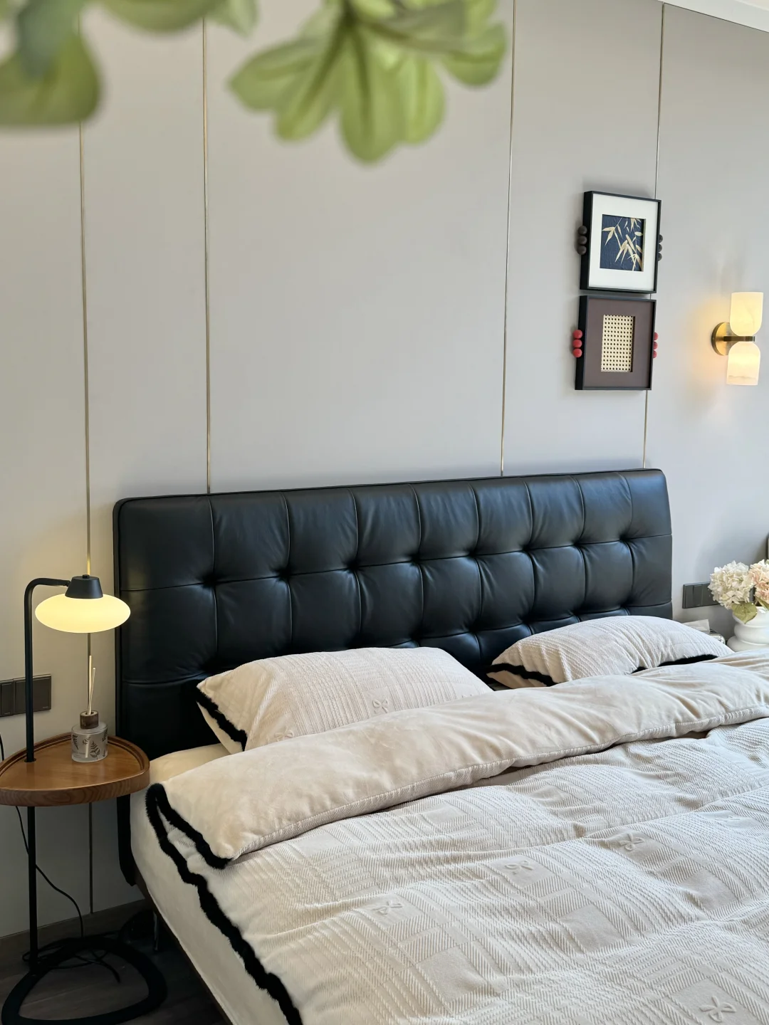 黑色华夫格真皮床真的是中古风卧室的点睛之笔✨胡桃色白蜡实木边框也很有格调!颜值这块是真没得说👍