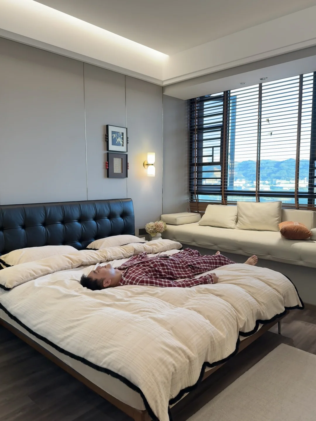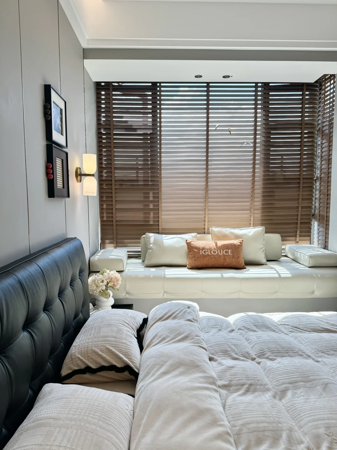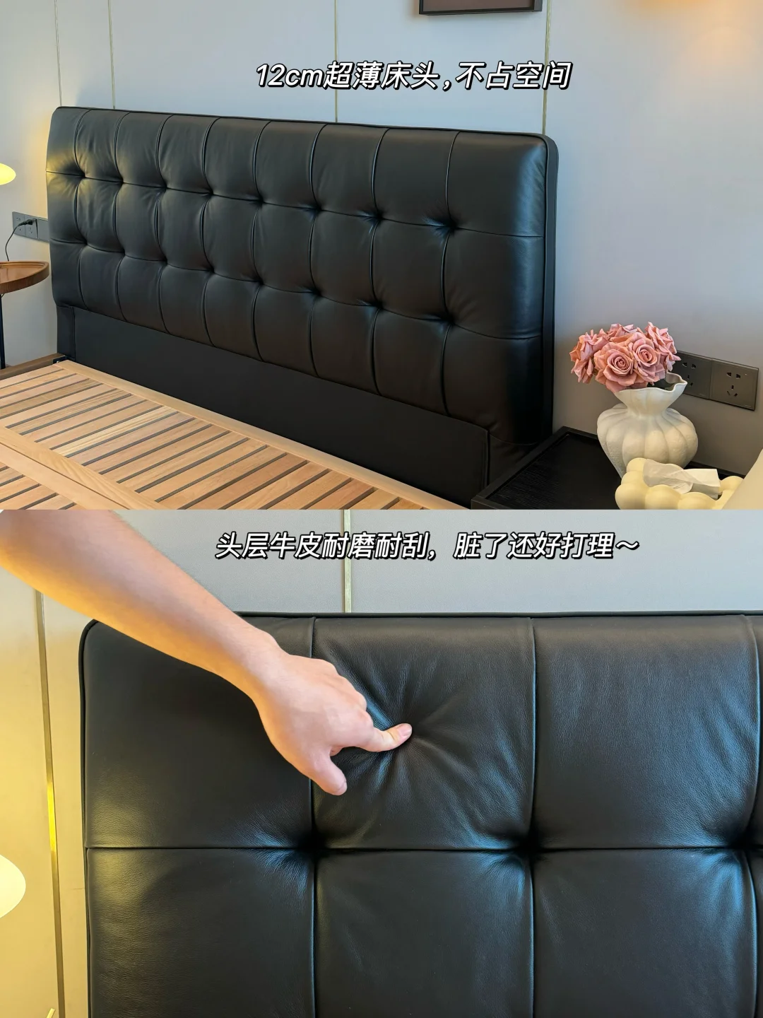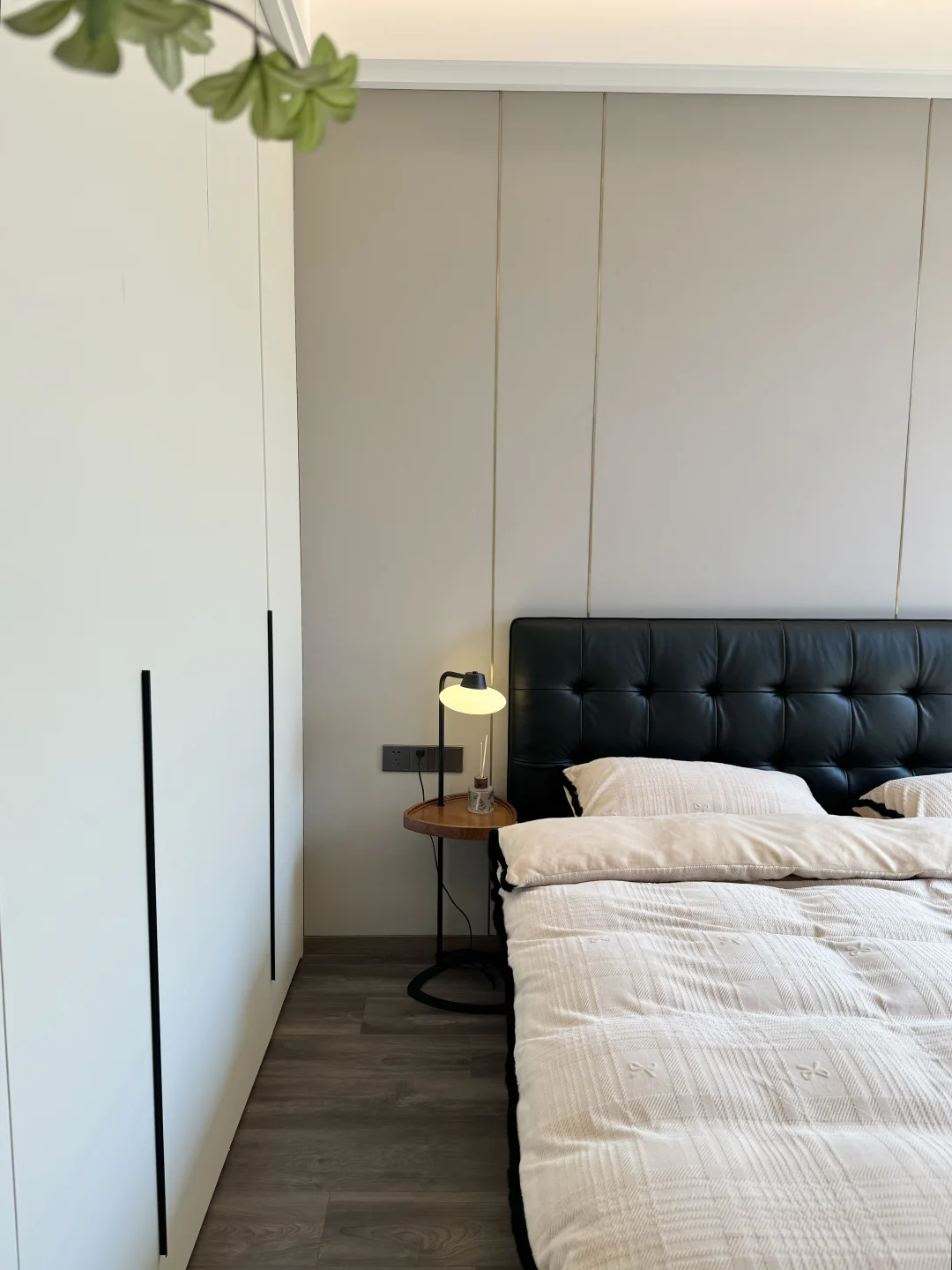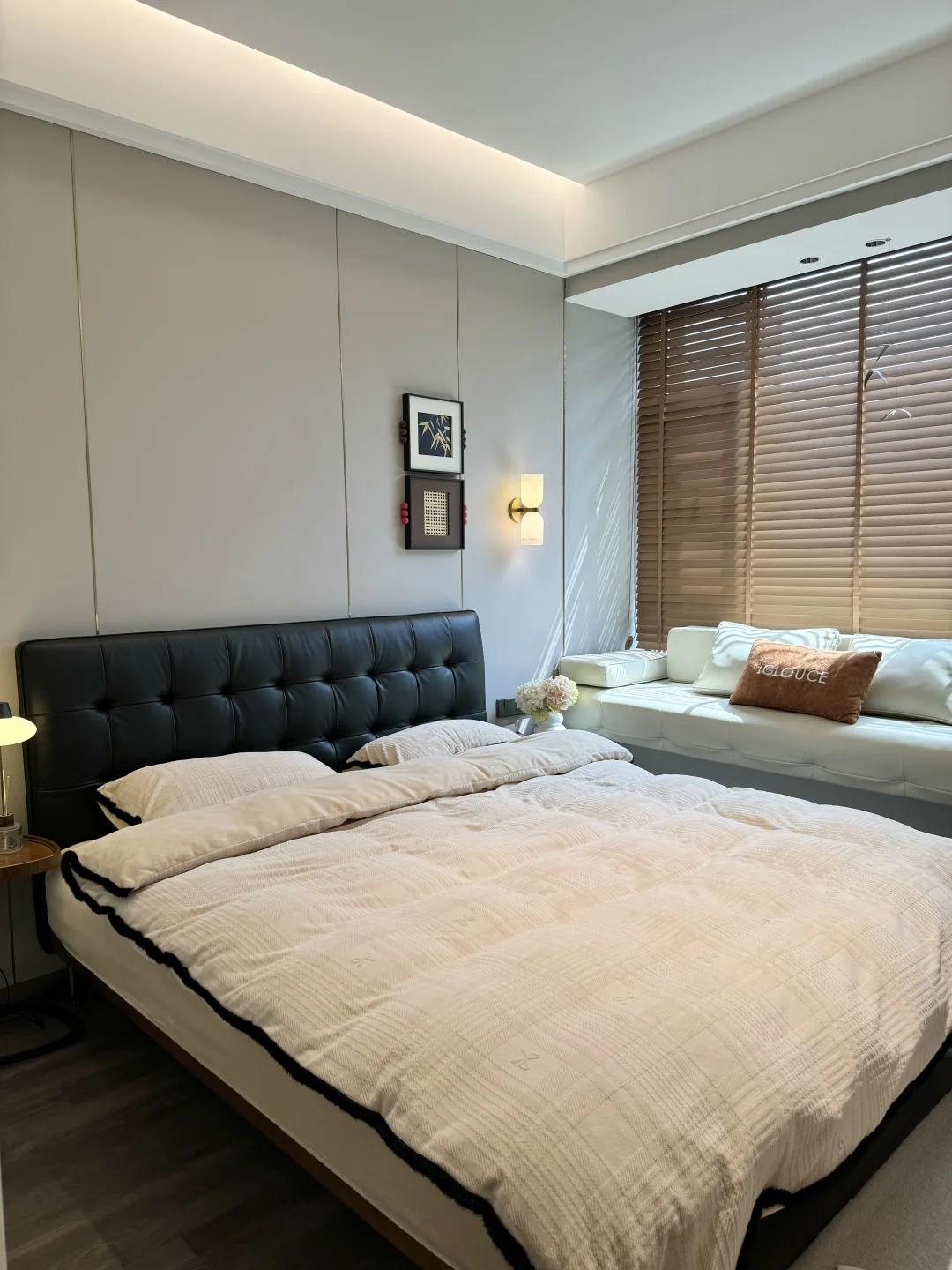 黑色华夫格真皮床真的是中古风卧室的点睛之笔✨胡桃色白蜡实木边框也很有格调!颜值这块是真没得说👍