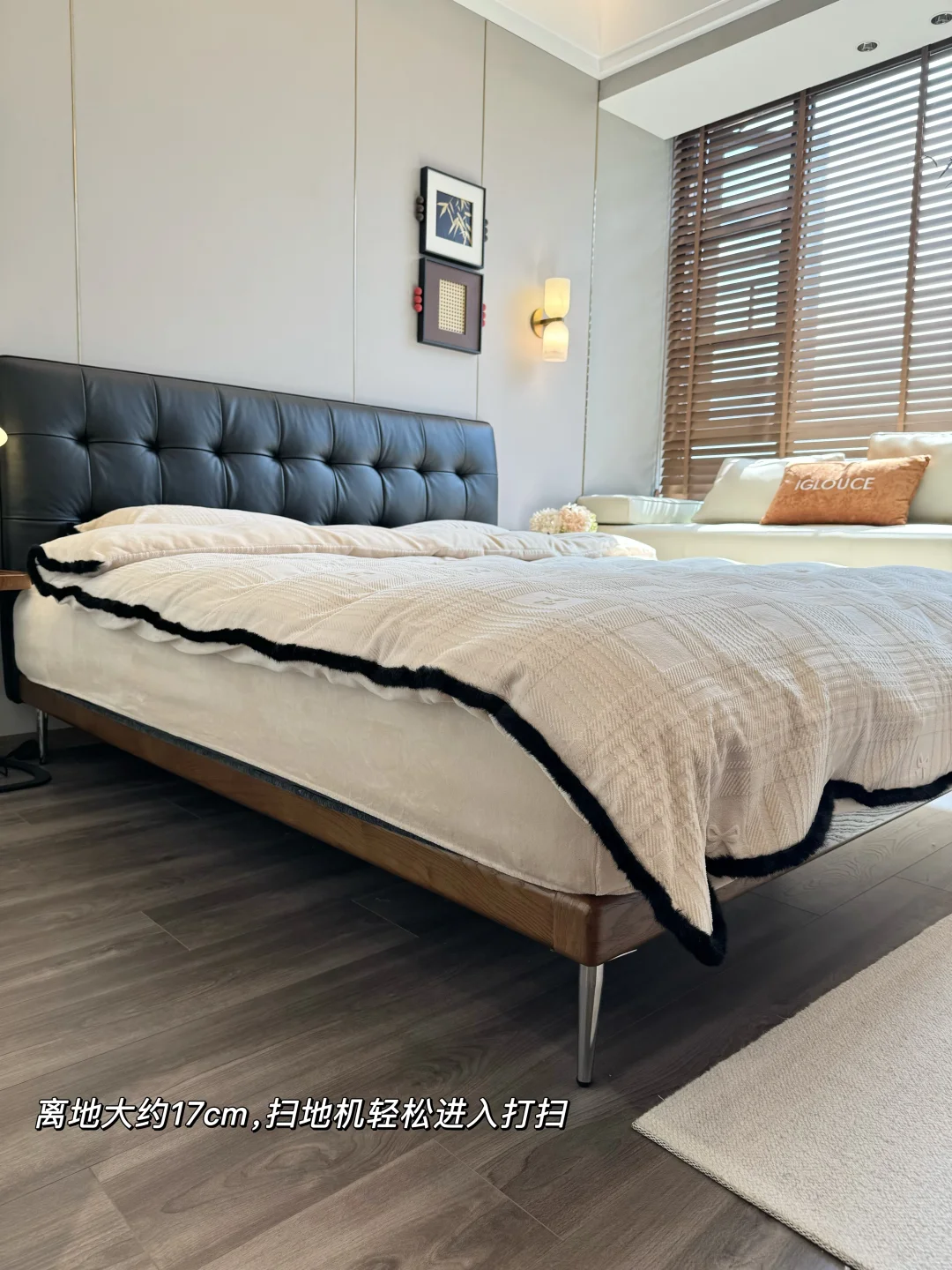 床脚距离地面有17cm 扫地机器人可以随意进出,平常打扫卫生也很方便~