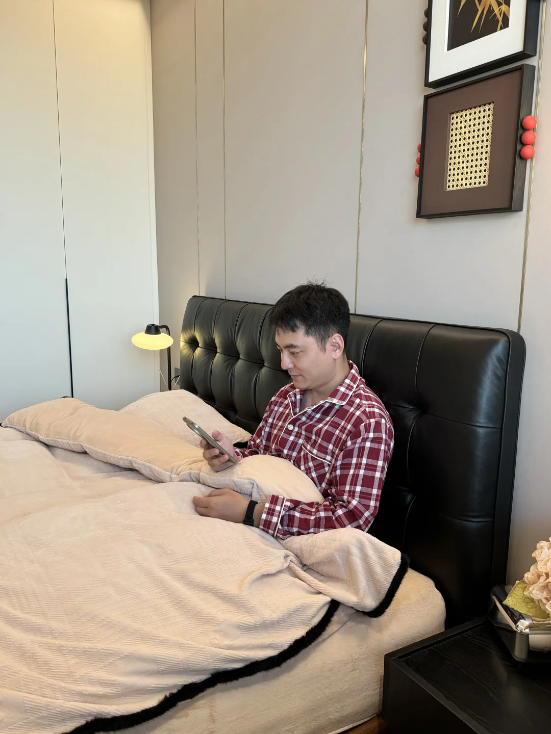 卧室床做了很久攻略,选择的是1.8米的宜洛家的华夫格真皮床🛏️