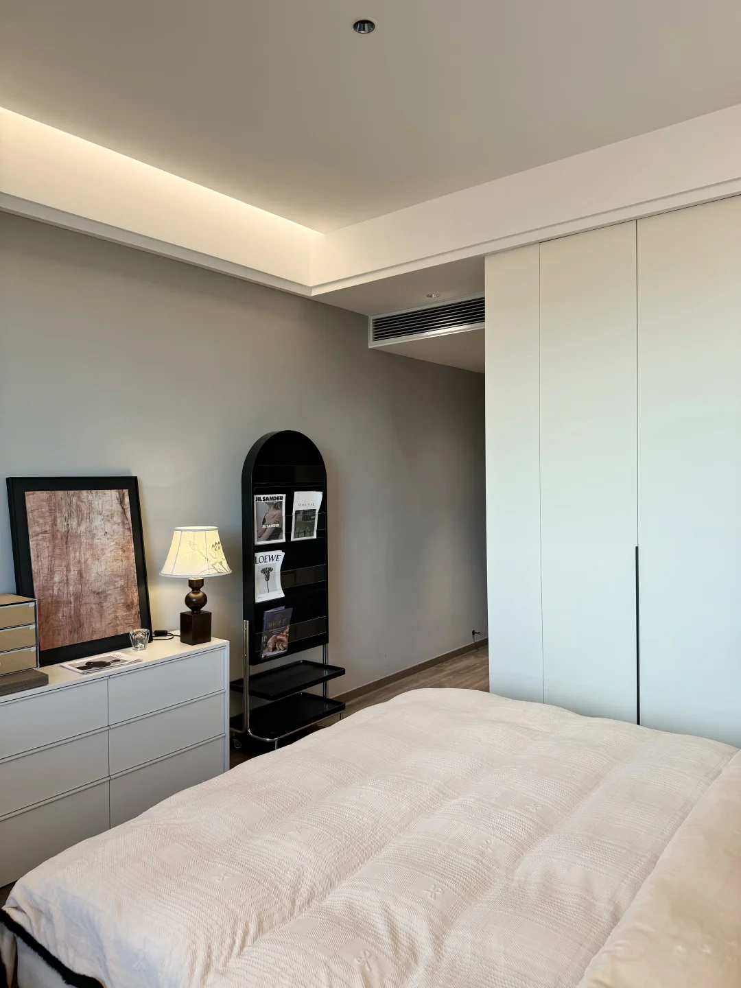 小户型卧室空间不大,12CM的薄床头和齐边设计就很省过道空间, 床尾还能留出位置摆个斗柜,放下后过道还有80cm的空间