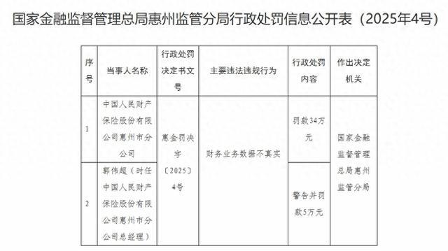 信网10月16日讯近日,中国人民财产保险股份有限公司惠州市分公司因财务业务数据不真实,被国家金融监督管理总局惠州监管分局处以34万元罚款,时任总经理郭伟超也受到警告并罚款5万元。