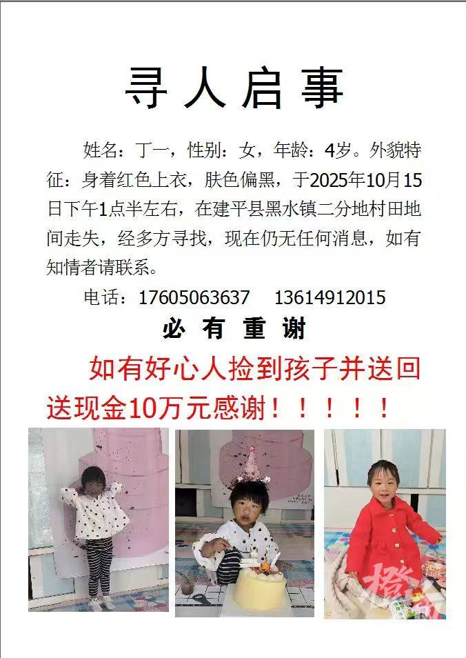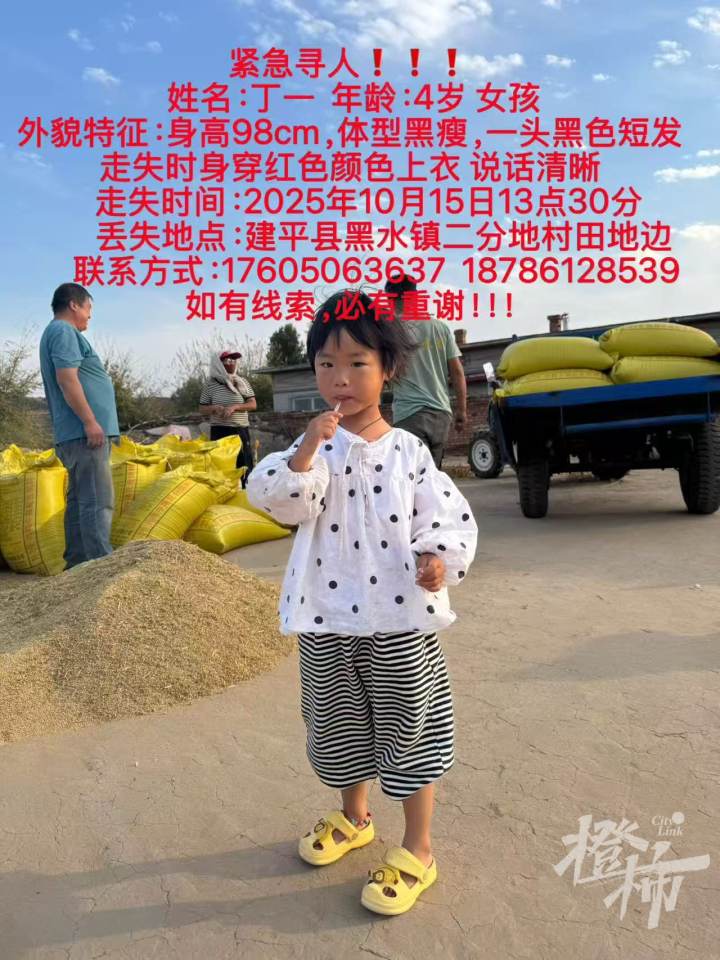 姓名:丁一,性别:女,年龄:4岁。外貌特征:身着红色上衣,肤色偏黑,于2025年10月15日下午1点半左右,在建平县黑水镇二分地村田地间走失,经多方寻找,现在仍无任何消息,如有知情者请联系。如有好心人捡到孩子并送回,送现金10万元感谢!