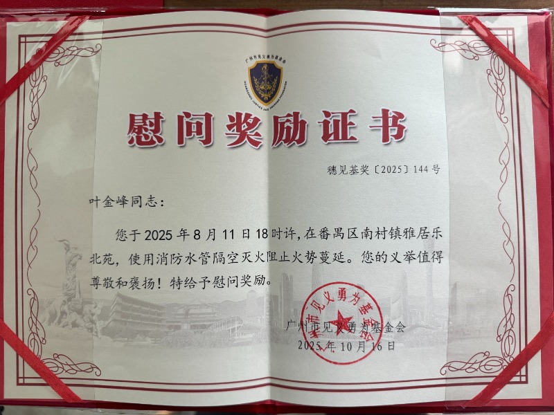 大皖新闻讯8月12日,大皖新闻记者报道了广州番禺区居民叶金峰跪抱水枪隔空灭火一事,引起广泛关注。10月16日,大皖新闻记者从广州市见义勇为基金会获悉,鉴于叶金峰使用消防水管隔空灭火阻止火势蔓延的义举,该基金会特为其颁发了“慰问奖励证书”。对此,叶金峰表示,他深感荣幸。
