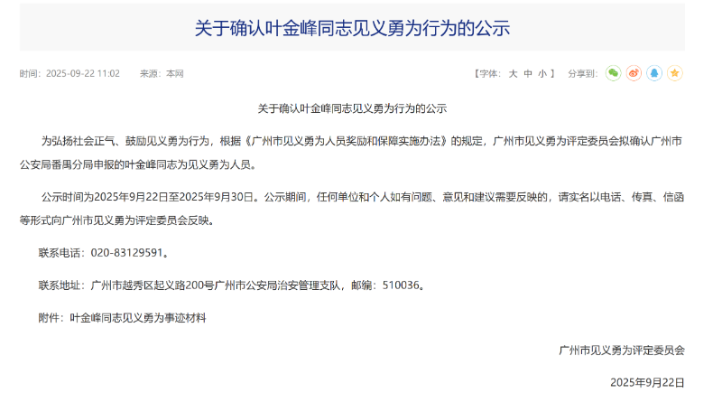此外,记者还注意到,日前,广州市公安局官网发布了《关于确认叶金峰同志见义勇为行为的公示》,广州市见义勇为评定委员会拟确认广州市公安局番禺分局申报的叶金峰同志为见义勇为人员。截至2025年9月30日,公示期已满,但最终的认定情况还未对外公布。