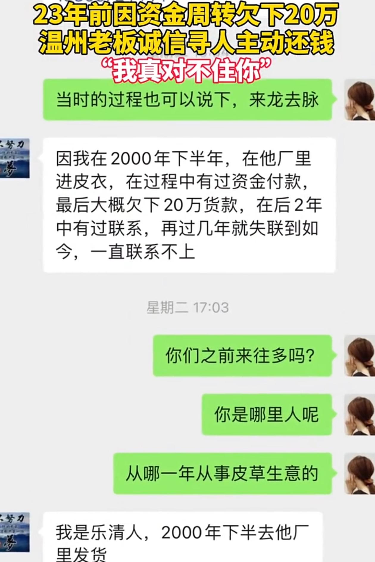 还是好人多!浙江一老板开厂破产,背负300多万外债,正当他走投无路时,竟然有人主动找上门来,不光替他还清了所有债务,还塞给他20万生活费,这反转把老板看傻了。 浙江宁波的孙国新,曾经是当地有名的皮衣厂老板,开着奔驰住着别墅,厂里100多号工人,订单排到半年后,可如今却住在城中村的出租屋里,每天为了几十块钱的菜钱发愁,这可把老孙愁坏了,谁料一个陌生电话改变了一切。 电话那头的声音有些陌生又有些熟悉,"孙总,我是小夏啊,20年前在您那拿过货的",孙国新努力回想,脑海里浮现出一个瘦小的身影,那时候夏超前刚20出头,拿了一批皮衣去外地卖,货款一共23万8千块,小伙子东拼西凑只凑了3万块,剩下的20多万实在拿不出来。 "孙总,当年那笔货款我一直记着呢",夏超前在电话里哽咽了,原来他这些年生意越做越大,在义乌开了三家贸易公司,年营业额过亿,早就想找恩人报恩,可孙国新工厂倒闭后就像人间蒸发了,托人打听了整整5年才找到,"您现在在哪?我马上过来!" 第二天上午10点,一辆黑色宝马停在了孙国新租住的小区楼下,夏超前提着两大袋水果上了楼,看到恩人住在不足40平米的出租屋里,眼眶一下子红了,"孙总,当年要不是您那句'有钱了再说',我早就撑不下去了",说着从包里掏出一张320万的支票。 孙国新愣住了,推着支票说:"你那20万货款早就不用还了,这钱我不能要",夏超前却说:"这不光是还债,您的300万外债我都打听清楚了,这笔钱您收下,剩下的20万就当我孝敬您的",两个大男人在出租屋里抱头痛哭。 网友们看到这一幕纷纷感慨:"这年头借100块都能翻脸的人一大把,20年的债还能主动上门还,还多给100多倍,这是什么神仙友谊",还有网友说:"孙老板当年种下的善因,20年后结出了善果,老天爷看着呢"。 楼下卖菜的大妈也说:"老孙这人确实厚道,我们买菜差个三五块他从来不计较,说下次给就行,没想到他自己落难了还有人记着他的好"。 其实这背后是人性最朴素的道理,当年孙国新对外放账700多万,大部分人赖账跑路,让他从千万富翁变成负债累累的穷人,可偏偏是他最不在意的那笔小账,却成了他人生的转机,这就像老话说的"积善之家必有余庆"。 夏超前后来跟朋友说:"做生意这么多年,我见过太多翻脸不认人的,但孙总当年的那份信任,让我明白了什么叫真正的格局",而孙国新拿着这笔钱东山再起,半年后重新开了家小型加工厂。 人这一辈子,钱会有赚完的时候,房子车子都可能失去,但你帮过的人、种下的善,会在某个时刻以你想不到的方式回报你,就像种子埋在土里,你看不见它发芽,可总有一天会长成参天大树为你遮风挡雨。 这或许就是人间最美的因果循环吧,你的善良终将成为你的铠甲,而那些懂得感恩的人,才是这世间最宝贵的财富。