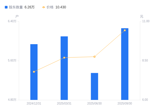 日期A股户数(户)流通A股户均持股数(股)户均持股市值(万元)2025-09-30626044911.765.122025-06-30534805749.735.032025-03-31609425045.714.382024-12-31593495181.144.042024-09-30553845552.073.932024-06-30638454816.282.882024-03-31606165072.853.642023-12-31578865312.094.332023-09-30765584016.514.142023-06-30596335156.475.03