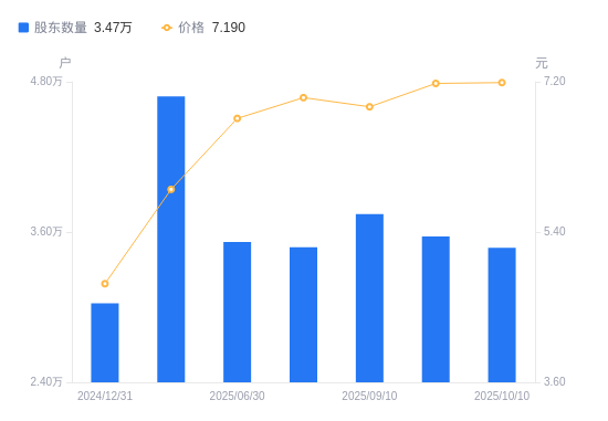 日期A股户数(户)流通A股户均持股数(股)户均持股市值(万元)2025-10-103474091117.9165.512025-09-203564888797.0063.762025-09-103742484583.0458.362025-08-293479090986.9463.782025-06-303520089927.1560.802025-03-314682667599.9639.962024-12-3130305104452.5449.942024-09-303489090726.1140.752024-06-303497890497.8535.442024-03-313441292352.5144.02