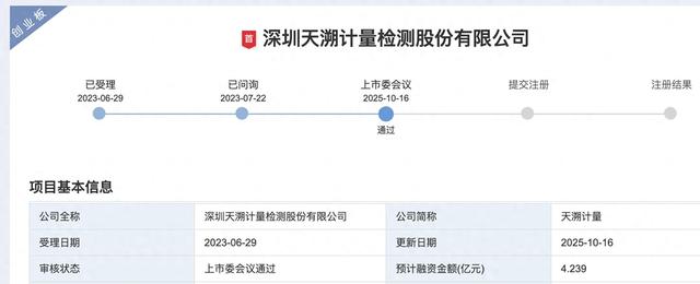 10月16日,深交所上市审核委员会召开2025年第23次上市审核委员会审议会议,审议深圳天溯计量检测股份有限公司(简称“天溯计量”)首发事项,最终公司顺利过会。