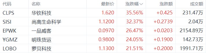 美股异动丨华钦科技涨44.06%,为涨幅最大的中概股