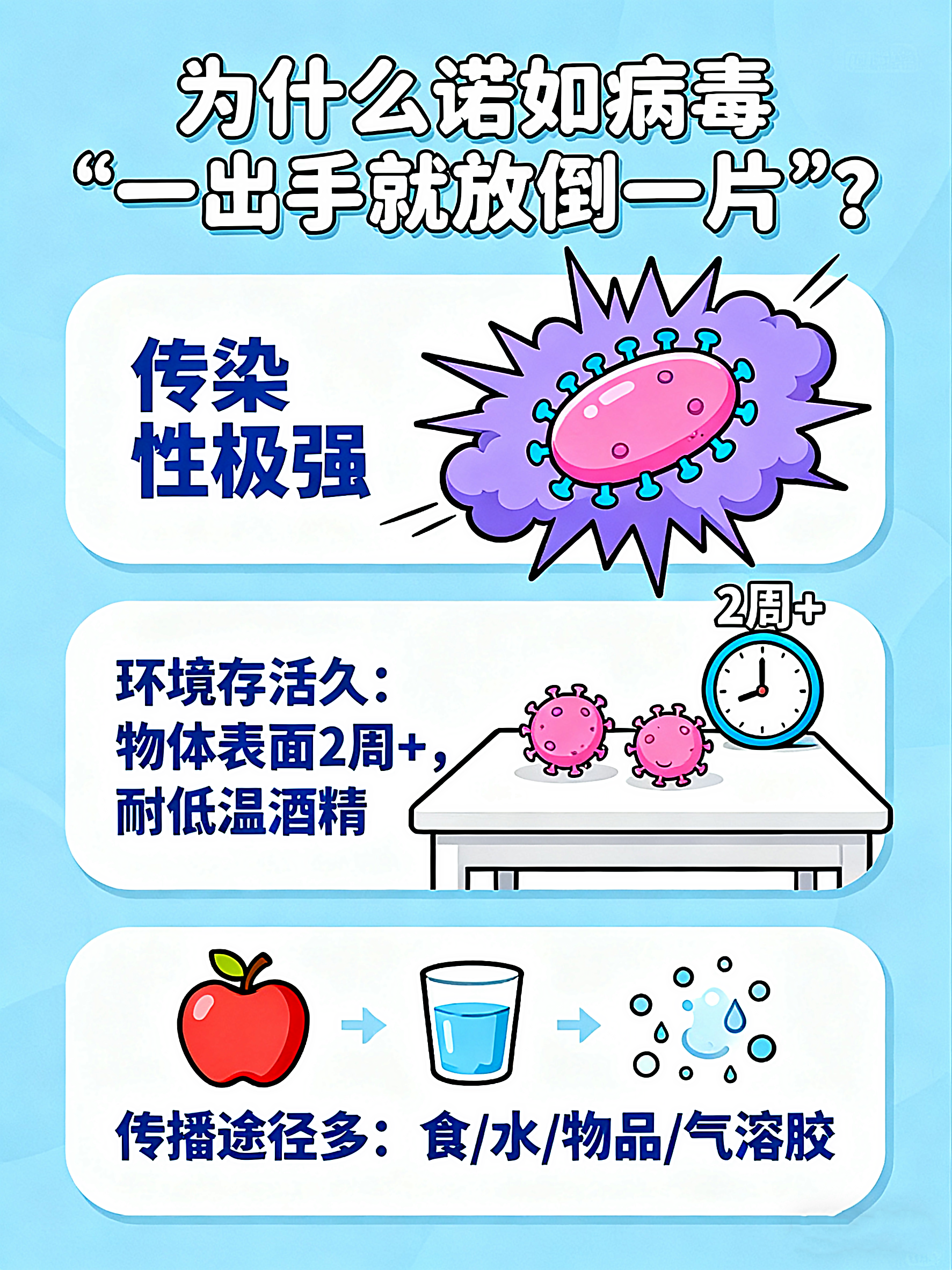 传染性极强:仅需18个病毒颗粒就能感染(1枚指甲盖大小的呕吐物可含数百万病毒!),是流感传染力的数十倍。