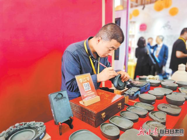 洮砚展品中既有传统的龙凤、花鸟题材,也有融合了莫高窟元素、丝绸之路主题的创新作品,展现了甘肃深厚的文化底蕴。一位北京当地书法爱好者端详后,当场研墨试笔,连声赞叹:“洮砚果然名不虚传,墨色饱满莹润,且聚而不渗,确实是砚中上品!”
