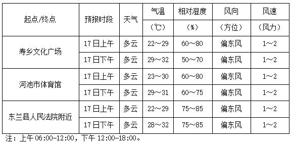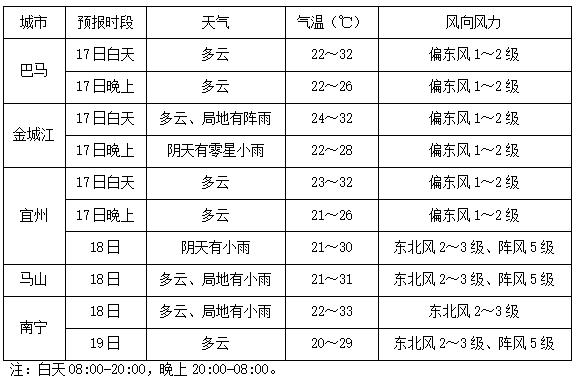 预计,17日下午,金城江-宜州路段,多云,偏东风1~2级。