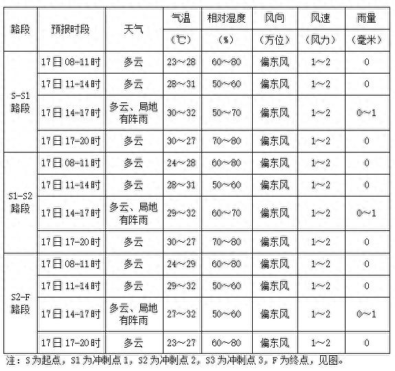 预计,今天(17日)白天多云、午后局地有阵雨,气温23~32℃,相对湿度50~80%。赛事期间,气温适宜,风力较小,天气总体有利于赛事活动。