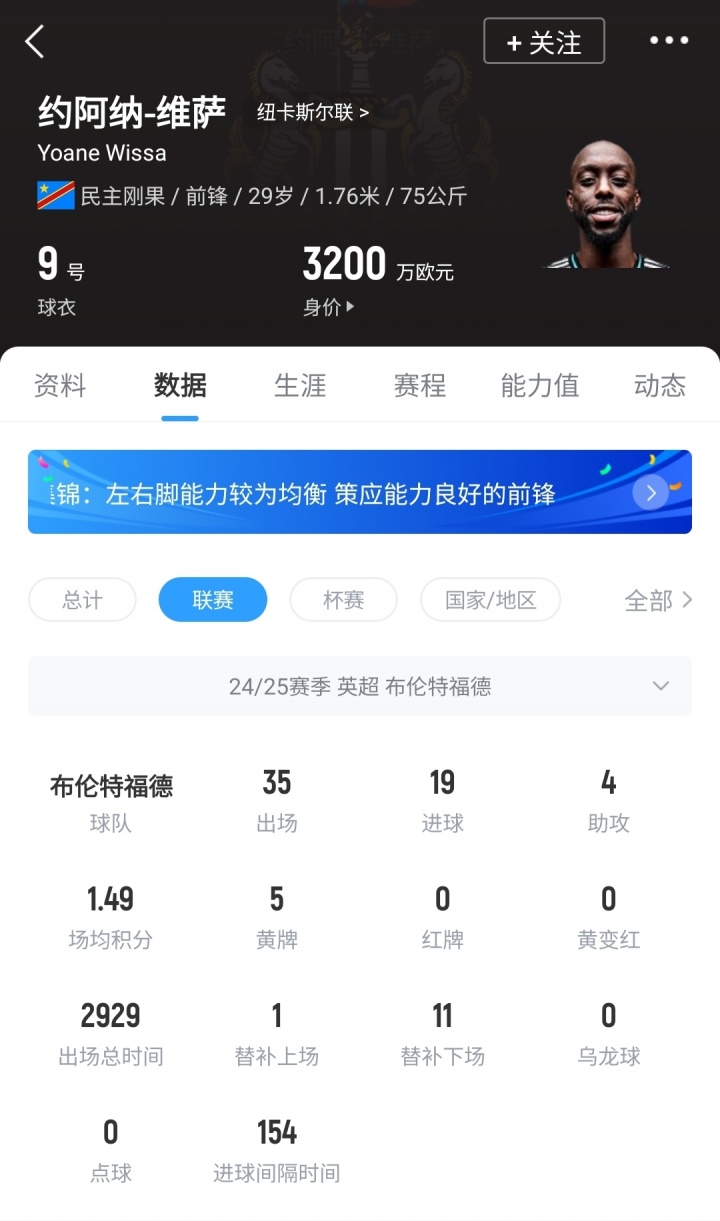 上赛季在布伦特福德,维萨出战35场比赛,打进19球4助,今夏为加盟纽卡,维萨一度罢训,最终纽卡花费5500万镑的高价才成功签下球员。