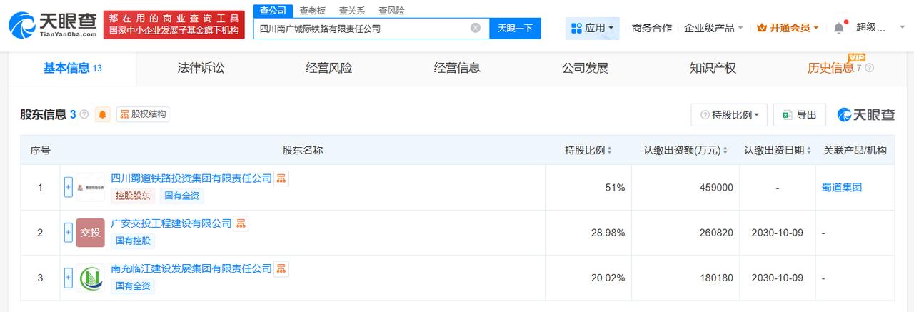 四川南广城际铁路公司登记成立注册资本90亿 天眼查工商信息显示,近日,四川南广城际铁路有限责任公司成立,法定代表人为唐勇,注册资本90亿人民币,经营范围包括公共铁路运输、铁路机车车辆维修、预应力混凝土铁路桥梁简支梁产品生产、建设工程质量检测等。股东信息显示,该公司由四川蜀道铁路投资集团有限责任公司、广安交投工程建设有限公司、南充临江建设发展集团有限责任公司共同持股。 天眼查信息:
