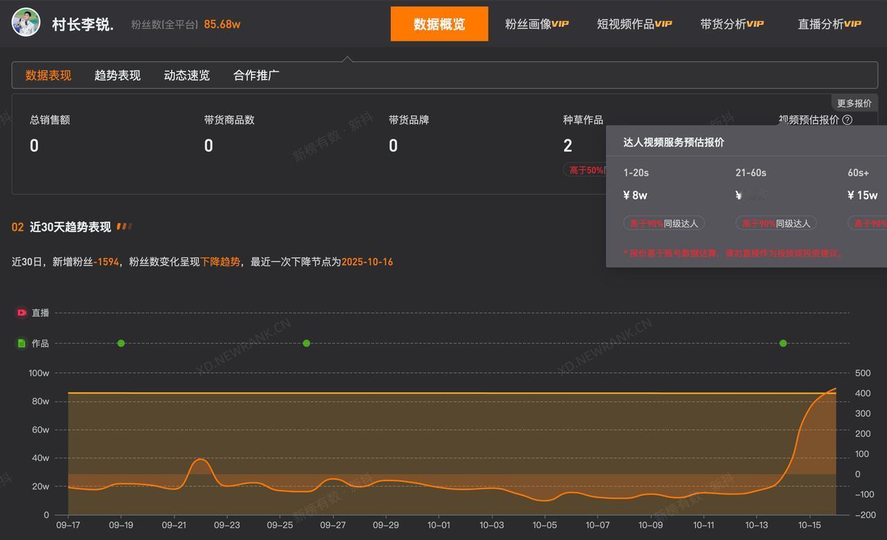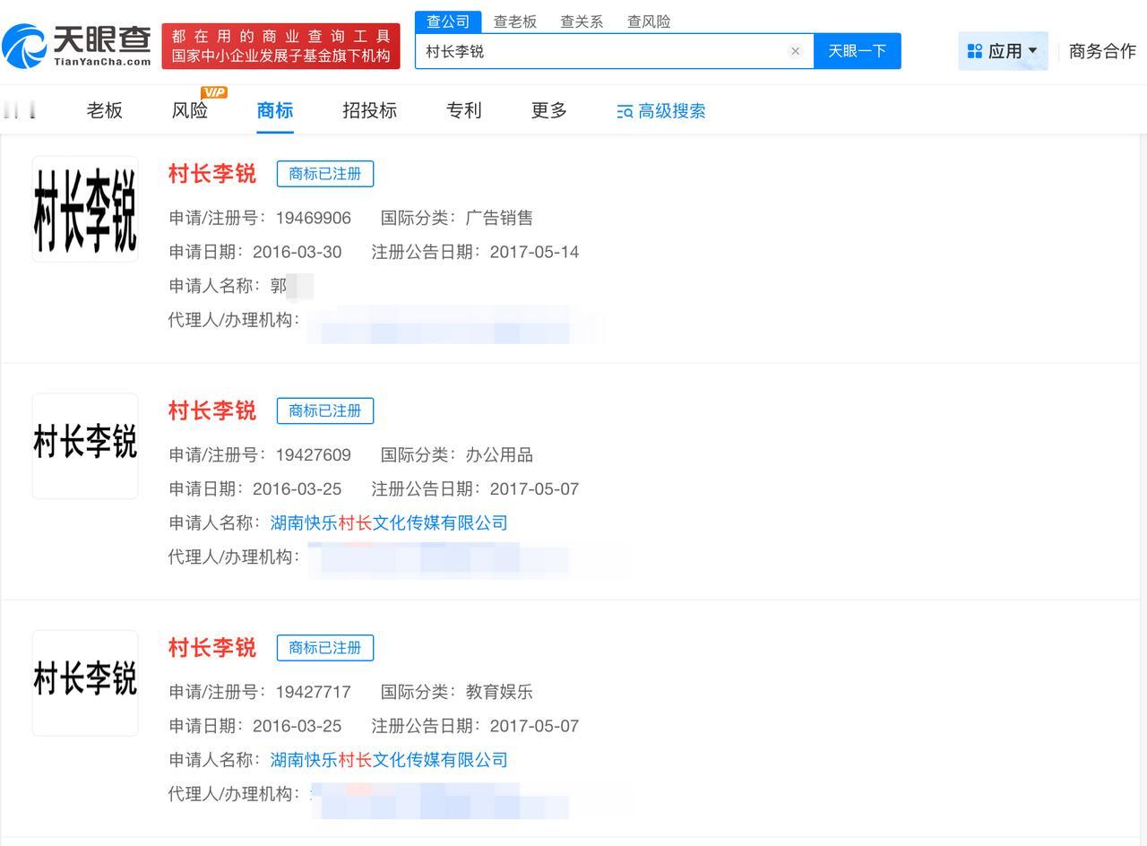 村长李锐1分钟视频报价15万 村长李锐商标遭多方抢注村长李锐已从湖南卫视离职 据媒体报道,10月16日,李锐宣布已从湖南卫视离职,结束26年主持生涯,目前正在创业。 第三方数据显示,“村长李锐.”视频平台账号1-20s视频预估报价为8万,21-60s视频预估报价为10万,60s+视频预估报价为15万。 天眼查任职信息显示,目前,李锐共关联4家企业,包括湖南看见网络科技有限公司、湖南喵爸村文化传媒有限公司等,均为注销状态。此外,“村长李锐”已被多方申请注册为商标,申请人包括湖南快乐村长文化传媒有限公司、自然人郭某等,国际分类涉及广告销售、办公用品等,当前部分商标已注册成功。 天眼查信息:-c2312330621