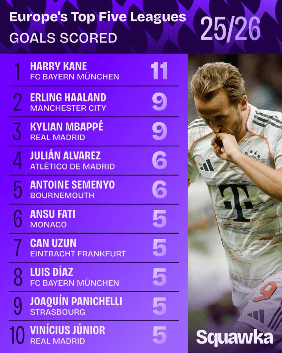虎扑10月17日讯Squawka统计了本赛季五大联赛目前的射手榜。