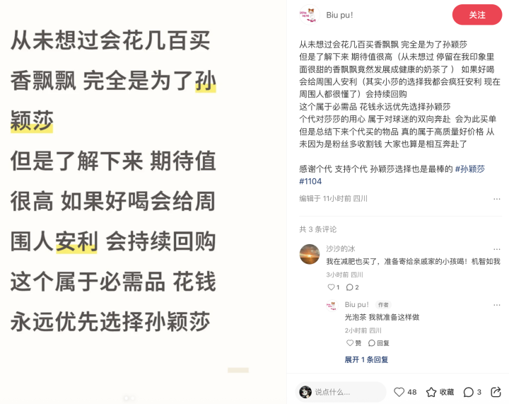 还有网友在小红书上发帖称:“从未想过会花几百元买香飘飘,完全是为了孙颖莎。但是了解下来期待值很高(从未想过,停留在我印象里面很甜的香飘飘,竟然发展成健康的奶茶了)如果好喝会给周围人安利,会持续回购。”