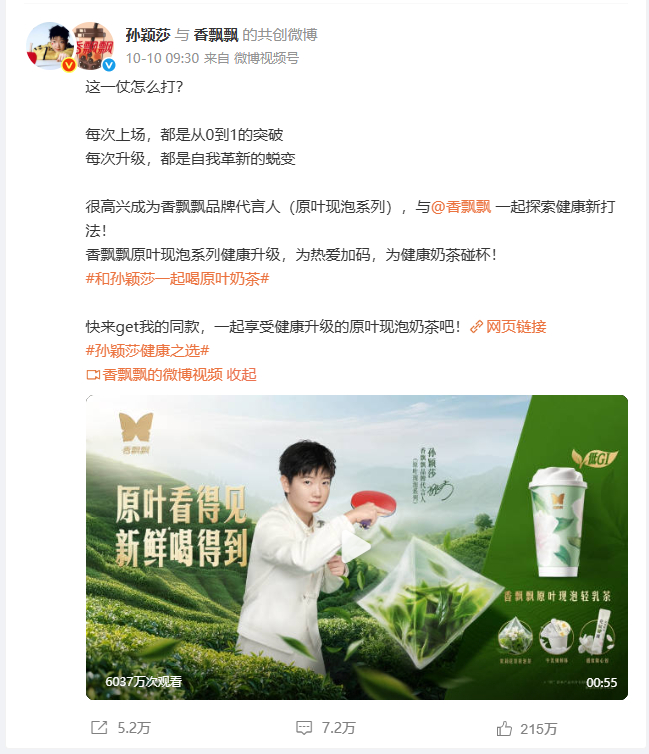香飘飘官宣代言人当天,孙颖莎也在微博上透露了这一消息:“很高兴成为香飘飘品牌代言人(原叶现泡系列),与@香飘飘一起探索健康新打法!香飘飘原叶现泡系列健康升级,为热爱加码,为健康奶茶碰杯。”这一消息的留言达到7.2万,同时获得了215万的点赞。