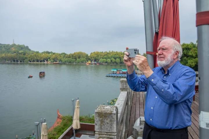 今天一早,他来到湖畔居,享用了丰盛的早餐。他喜欢临安的山核桃,惊讶西湖藕粉能那么快融化。当然,最喜欢的还是西湖美景,举着相机拍了好久。