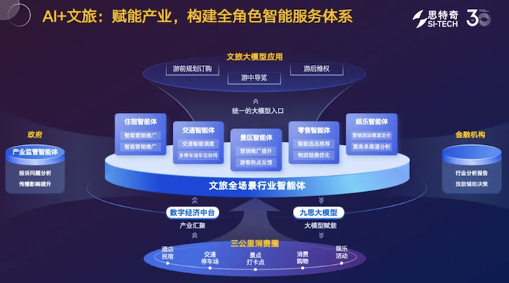 在文旅领域,思特奇以自研文旅大模型为核心,整合餐饮民宿、交通停车、景点打卡等"三公里消费圈"资源,构建覆盖游客、企业、政府的全角色智能生态。通过住宿、交通、景区、零售、娱乐五大智能体协同,实现游前规划、游中导览、游后维权全流程服务;政府借助产业监管智能体实现投诉分析与传播预测,全方位激活文旅产业活力。