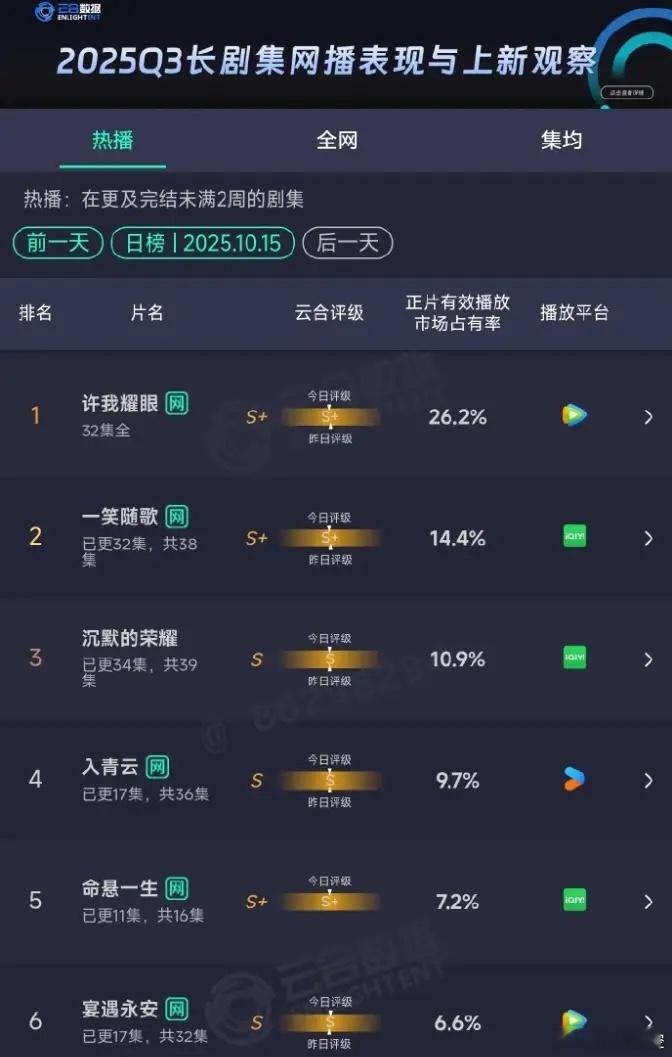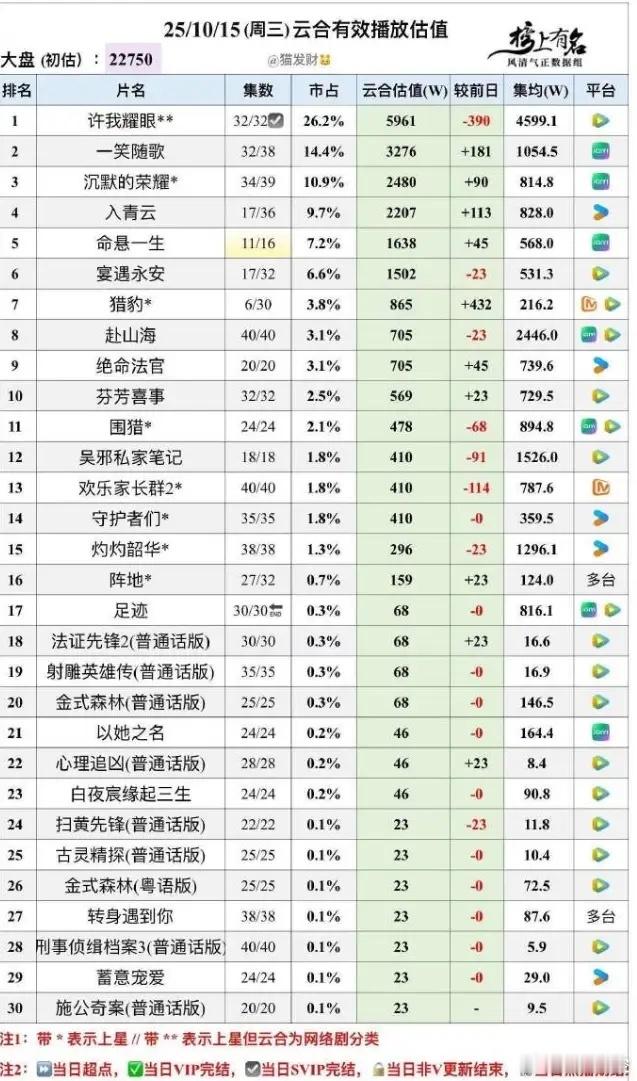这部剧已经收官好几天了,但是后面播的几部剧确实不顶打,云合占比15%都达不到,娱乐圈大部分流量男演员不扛剧是事实,但是如果搭档的一番女主也不扛剧,确实容易扑,《许我耀眼》云合集均已经到4600万了,超了杨幂的《生万物》。