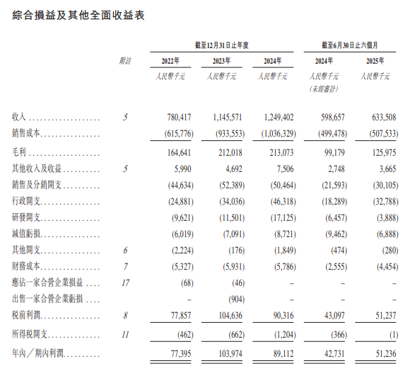 招股书显示,在过去的2022年、2023年、2024年和2025年前六个月,新荷花的营业收入分别人民币7.80亿、11.46亿、12.49亿和6.34亿元,相应的净利润分别为人民币0.77亿、1.04亿、0.89亿和0.51亿元。