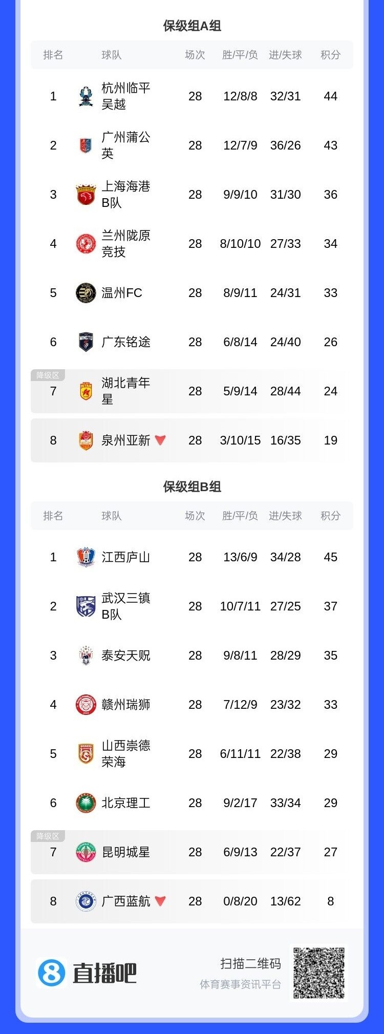 至此,中乙本赛季降级队全部确定:湖北青年星、泉州亚新、昆明城星、广西蓝航。
