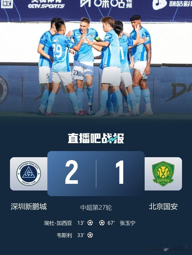 在刚结的一场事关保级的焦点战中!深圳新鹏城主场2:1爆冷 击败了中超联赛的第四名北京国安队!目前深圳新鹏城距离降级区高出五分之多!在联赛还剩三轮的情况下,保级形势大好! 在本轮中超联赛开打之前,北京国安就因为最近状态太差。主帅塞蒂恩下课了!换帅后的北京国安其实还挺让人期待的! 但是今天的比赛过程完全被深圳新鹏城掌控!上半场第十三分钟埃杜.加西亚便利用用速度生吃北京国安后卫,随后过掉北京国安门将候森后打空门得手!深圳新鹏城开局相当梦幻! 二十分钟过后,本场发挥出色的姜至鹏 左路下底横传,韦斯利门前抢射中的!上半场深圳新鹏城便已经2:0领先北京国安! 下半场易边再战,北京国安在第67分钟,张稀哲策动攻势,何宇鹏套上倒三角传球!张玉宁禁区中路撞射破门1:2!北京国安扳回一球!随后双方互有攻势!都没有再次进球!最终,深圳新鹏城2:1战胜北京国安,取得了保级的关键三分!