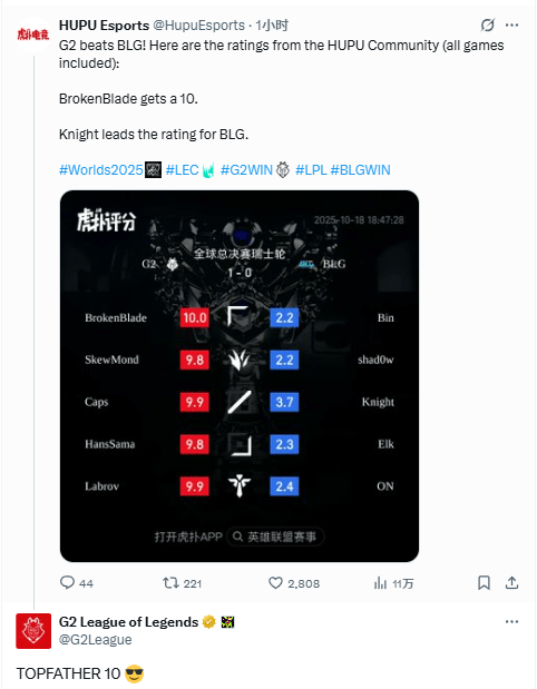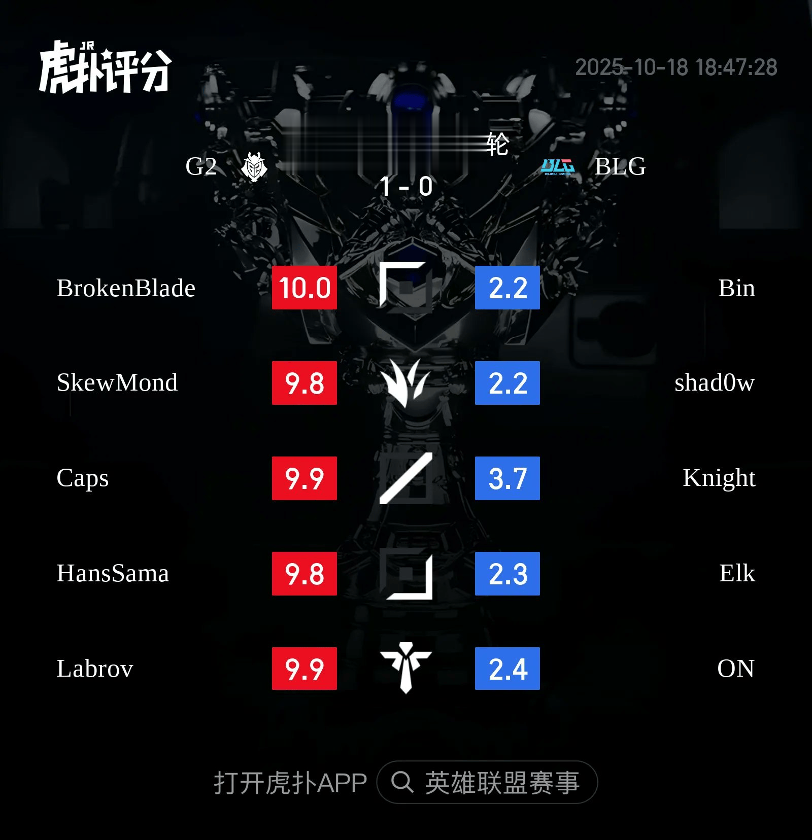 [-]虎扑官推发布G2上单BrokenBlade评分10分
