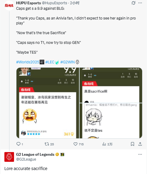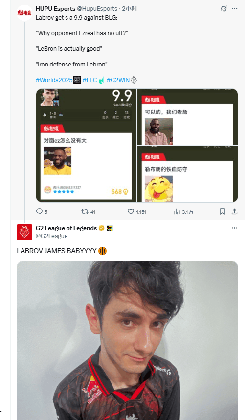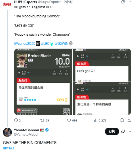 BLG不敌G2后,虎扑官推发布赛后选手评分,G2官推积极和虎扑官推互动,以下是具体互动内容: