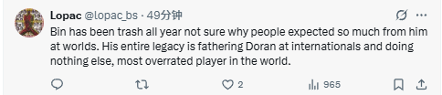 -Bin一整年都是垃圾,不知道为什么人们对他的期望如此之高,他的全部的成就是在国际比赛中教育多兰,除此之外什么都没有,世界上最被高估的选手。