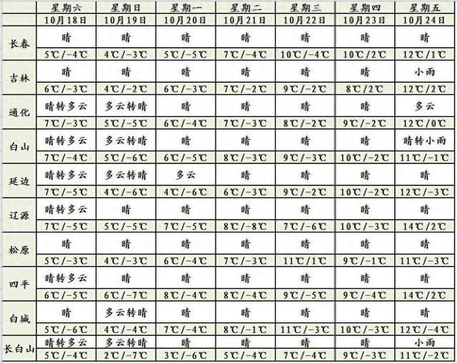 19日夜间到20日白天,全省晴有时多云,松原东北部、长春北部、吉林北部、白山东部、长白山保护开发区部分地方有雨夹雪或小雪。