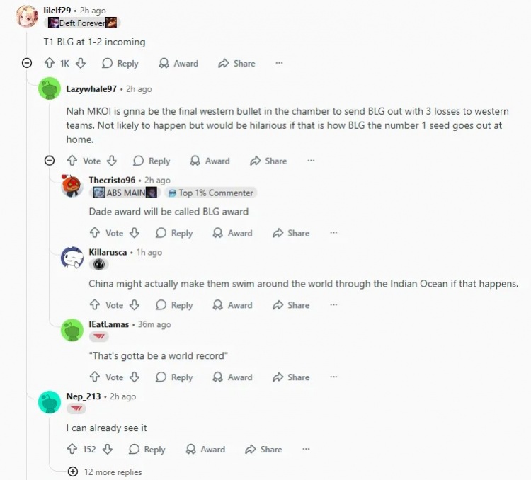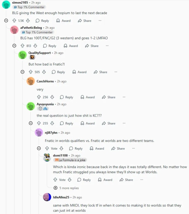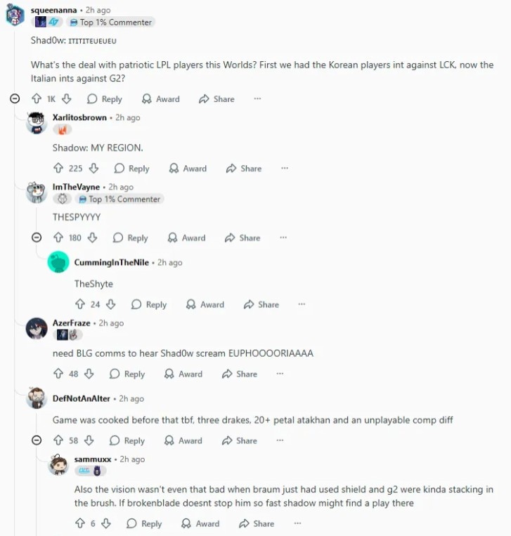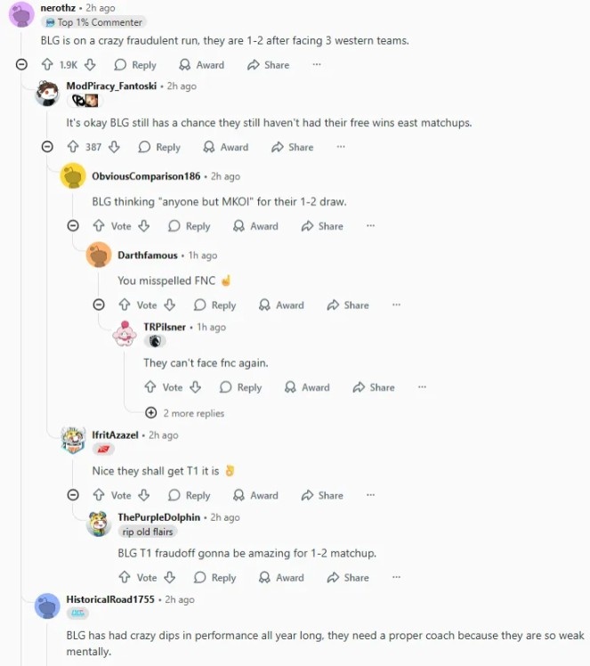 直播吧10月18日讯在今日结束的S15全球总决赛瑞士轮第三轮中,BLG以0-1不敌G2引发了Reddit网友热议;