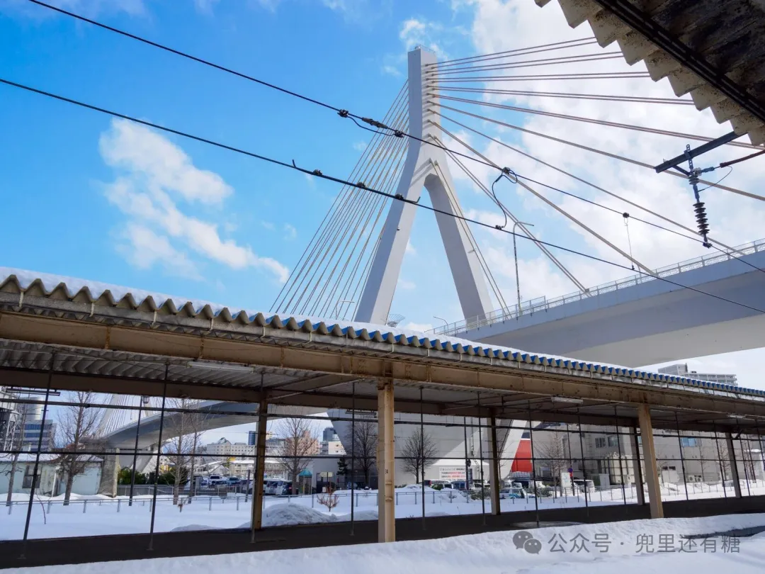 而在玻璃的另一边,可以看到青森湾大桥和青森港。白雪覆盖的大地与蔚蓝的大海和天空的对比。